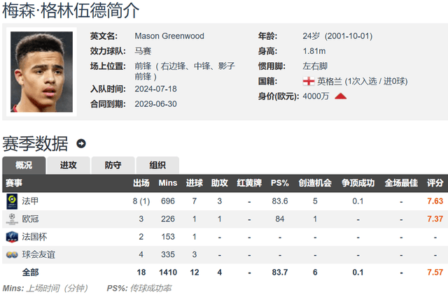 เมสัน กรีนวูด อายุ 24 ปี สูง 1.81 เมตร และถนัดทั้งสองเท้า สามารถเล่นได้ทั้งปีกทั้งสองข้างหรือตรงกลาง และสามารถเล่นในตำแหน่งกองหน้าหลายตำแหน่ง Transfermarkt ประเมินมูลค่าเขาไว้ที่ 40 ล้านยูโร กรีนวูดยังคงรักษาฟอร์มที่ยอดเยี่ยมในฤดูกาลนี้ โดยมีส่วนร่วมในการทำประตูเฉลี่ย 1 ประตูต่อเกม โดยเฉพาะอย่างยิ่ง เขาทำได้ 7 ประตูและ 3 แอสซิสต์จากการลงเล่น 9 นัดในลีกเอิง 1 และอีก 1 ประตูกับ 1 แอสซิสต์จากการลงเล่น 3 นัดในแชมเปียนส์ลีก รวมทั้งหมด 8 ประตูและ 4 แอสซิสต์จากการลงเล่น 12 นัด