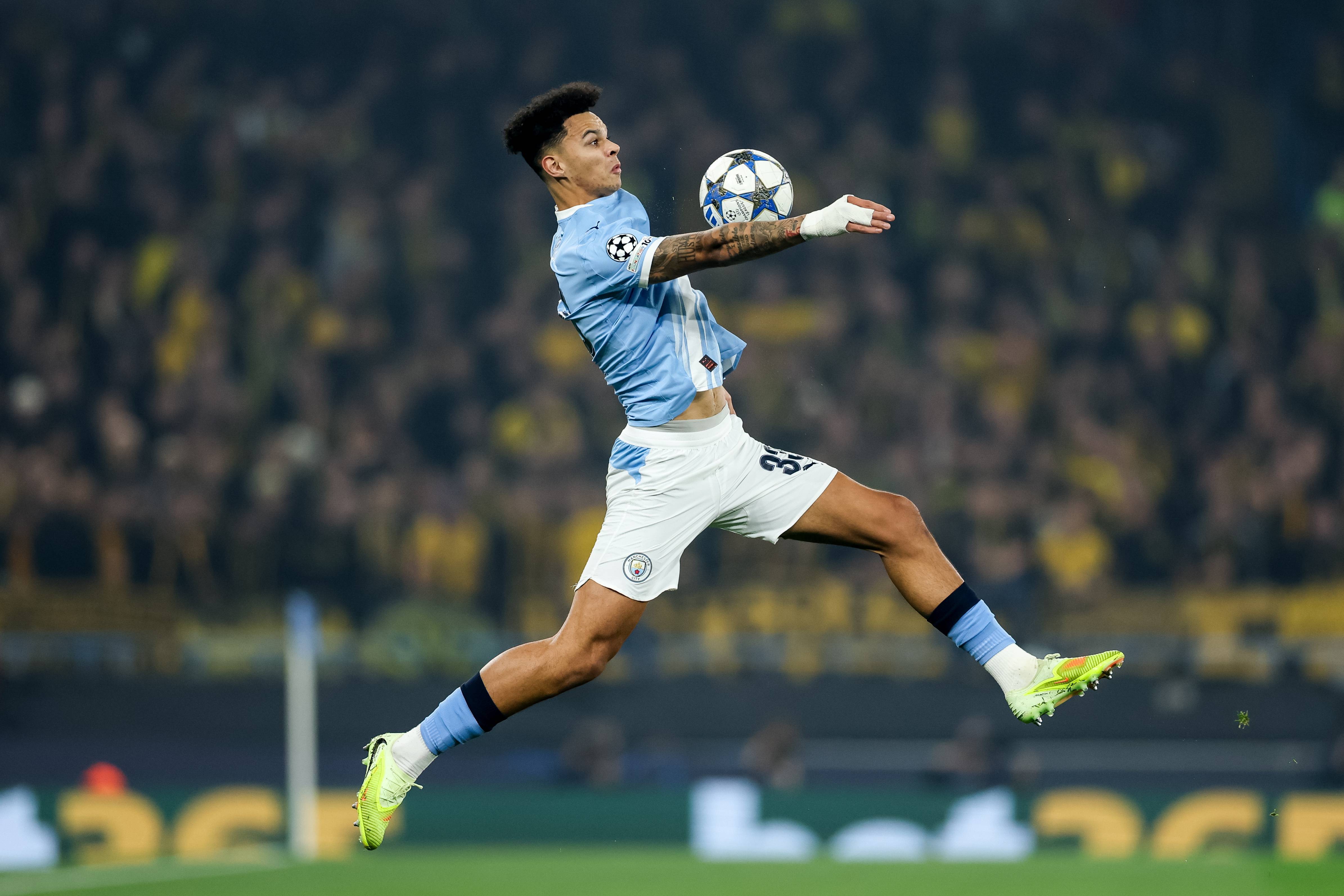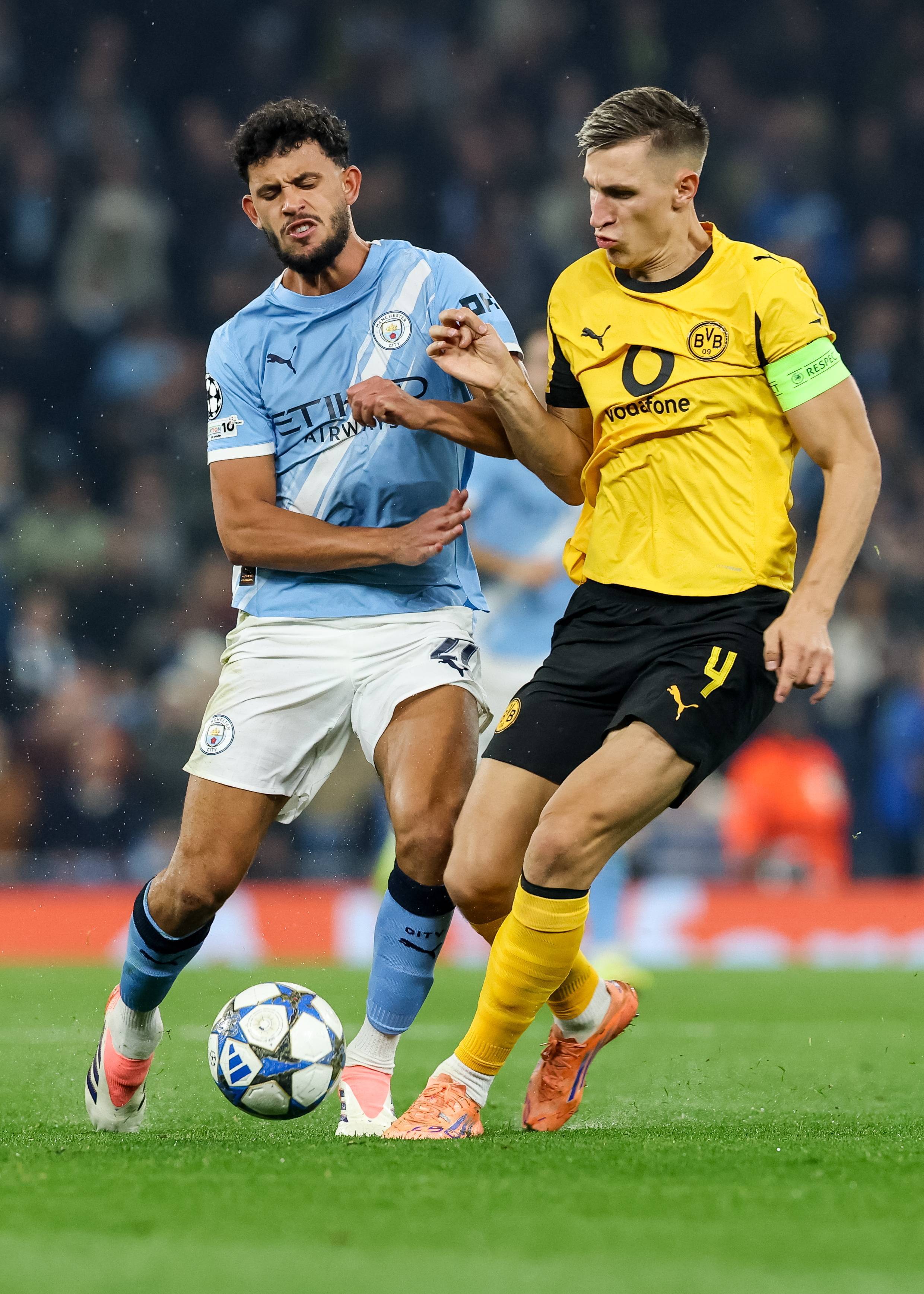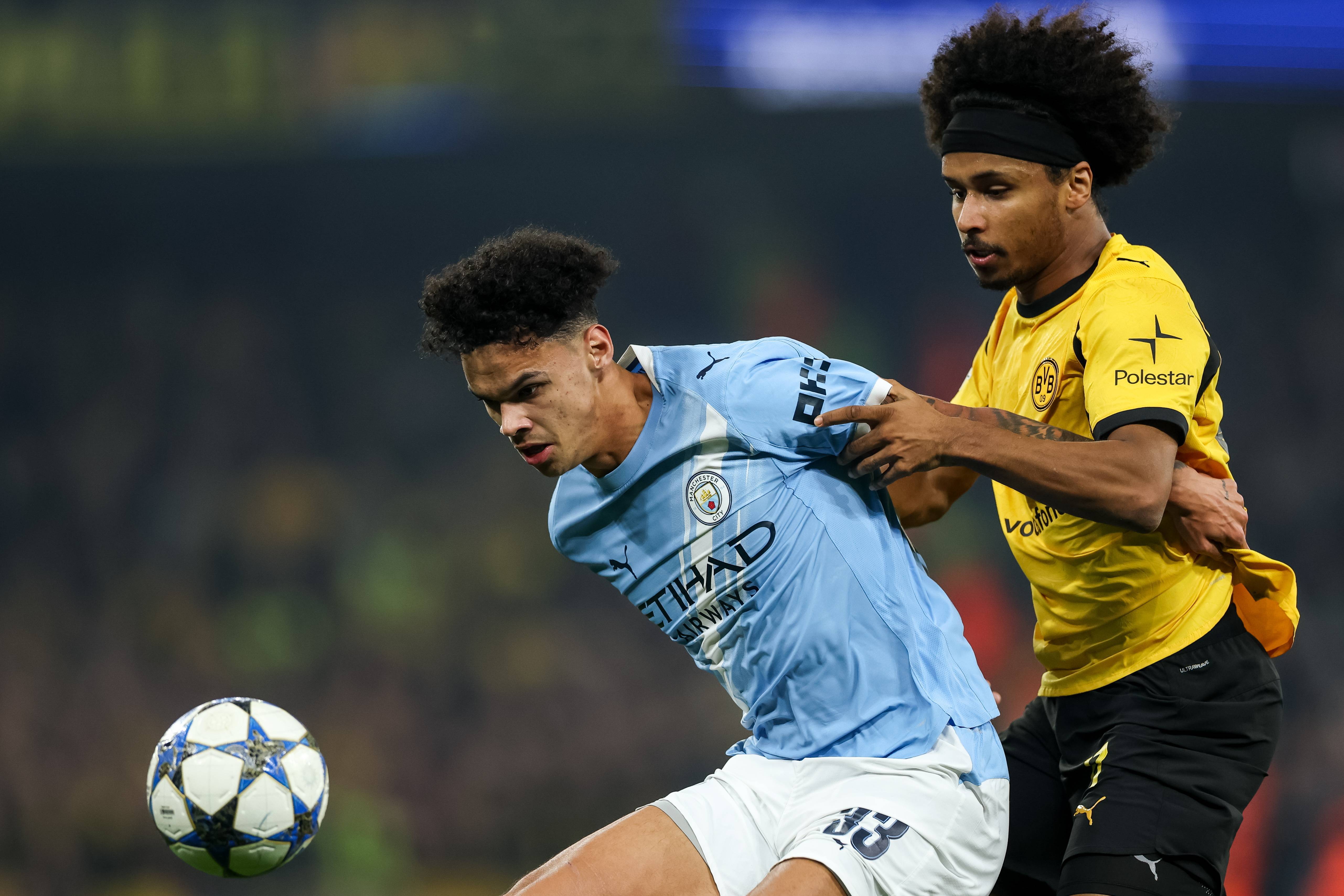เมื่อวันที่ 5 พฤศจิกายน โอ'ไรลีย์ ของแมนเชสเตอร์ ซิตี้ (ซ้าย) เข้าปะทะกับ อาเดโมลา อเดเยมี ของโบรุสเซีย ดอร์ทมุนด์ เพื่อแย่งบอล. ซีนา/อีพีเอ