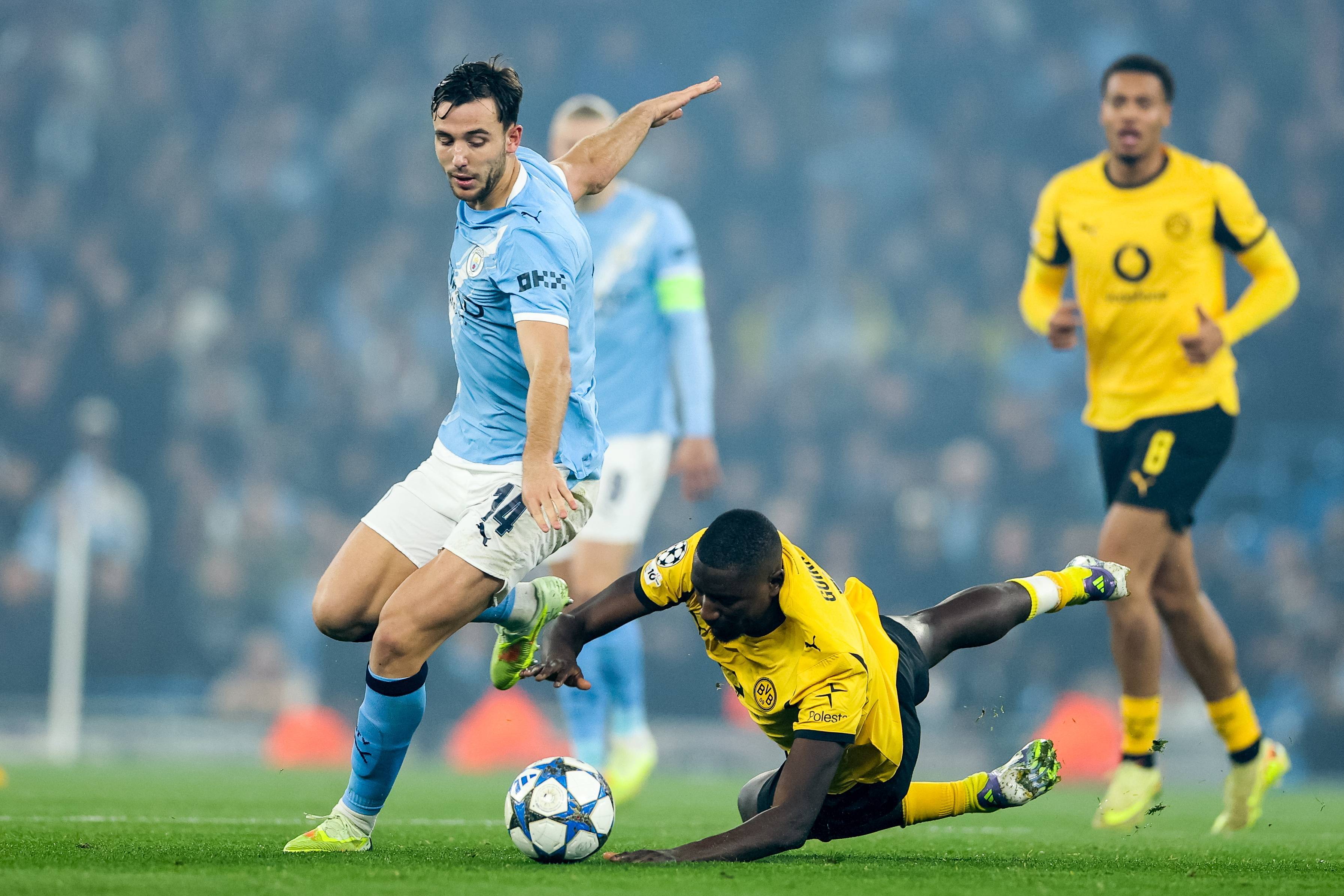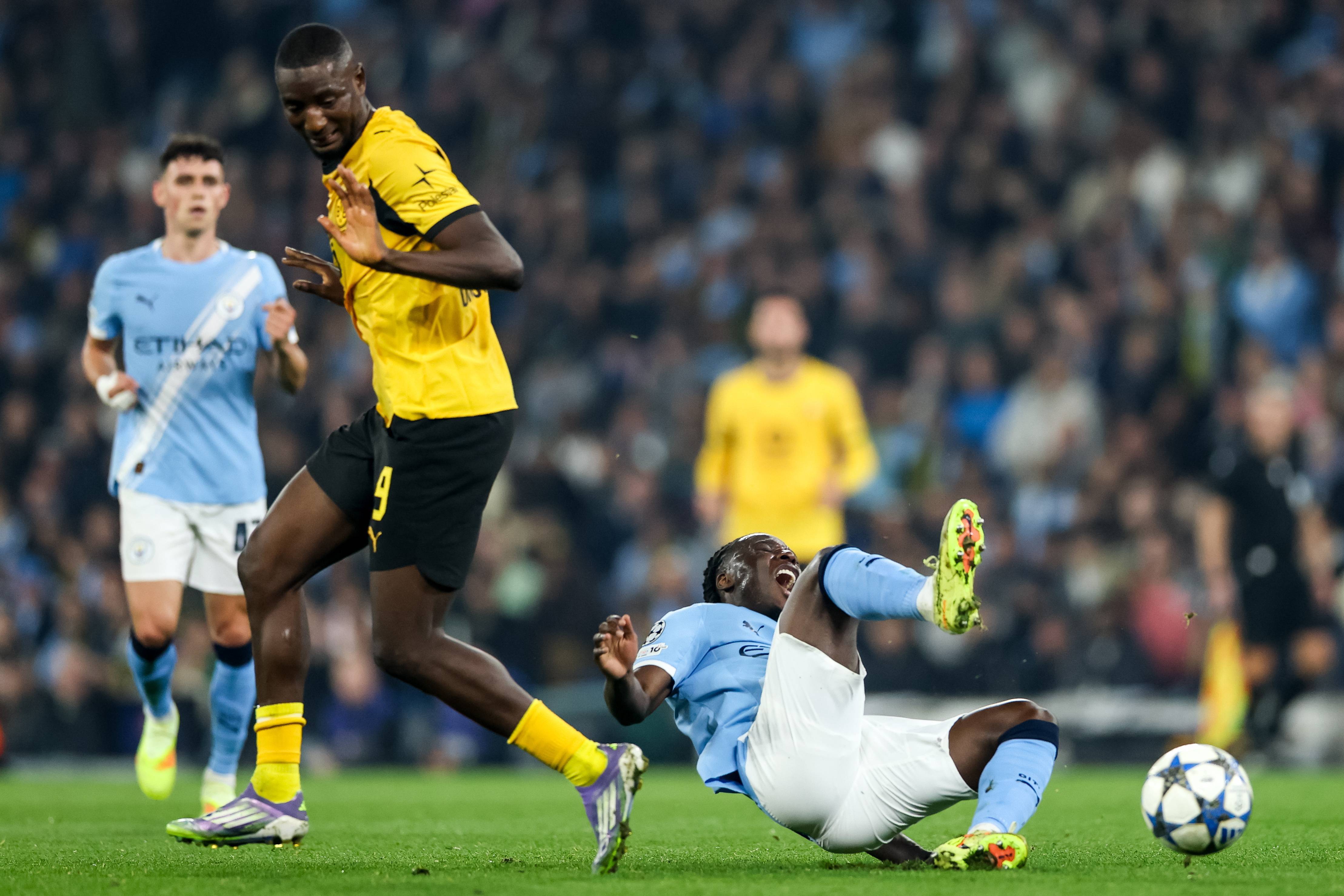เมื่อวันที่ 5 พฤศจิกายน ด็อกคู ของแมนเชสเตอร์ ซิตี้ (ขวา) ท้าทาย จิราซี ของโบรุสเซีย ดอร์ทมุนด์ เพื่อแย่งบอล. ซีเอ็นเอ็น/อีพีเอ