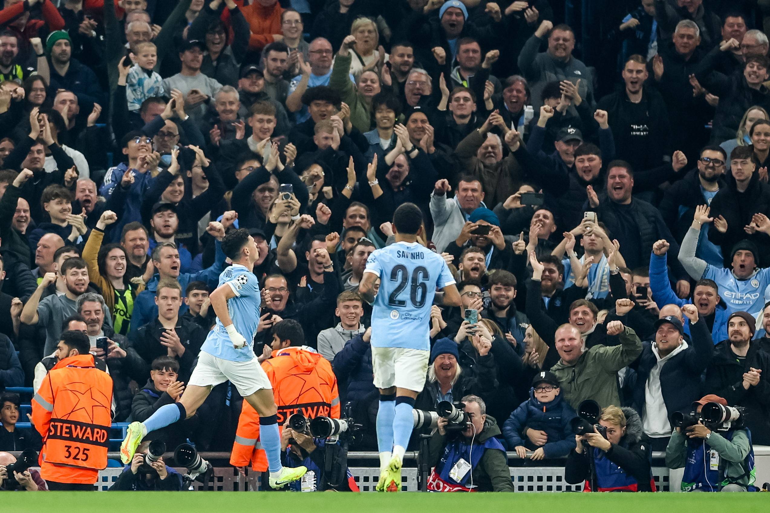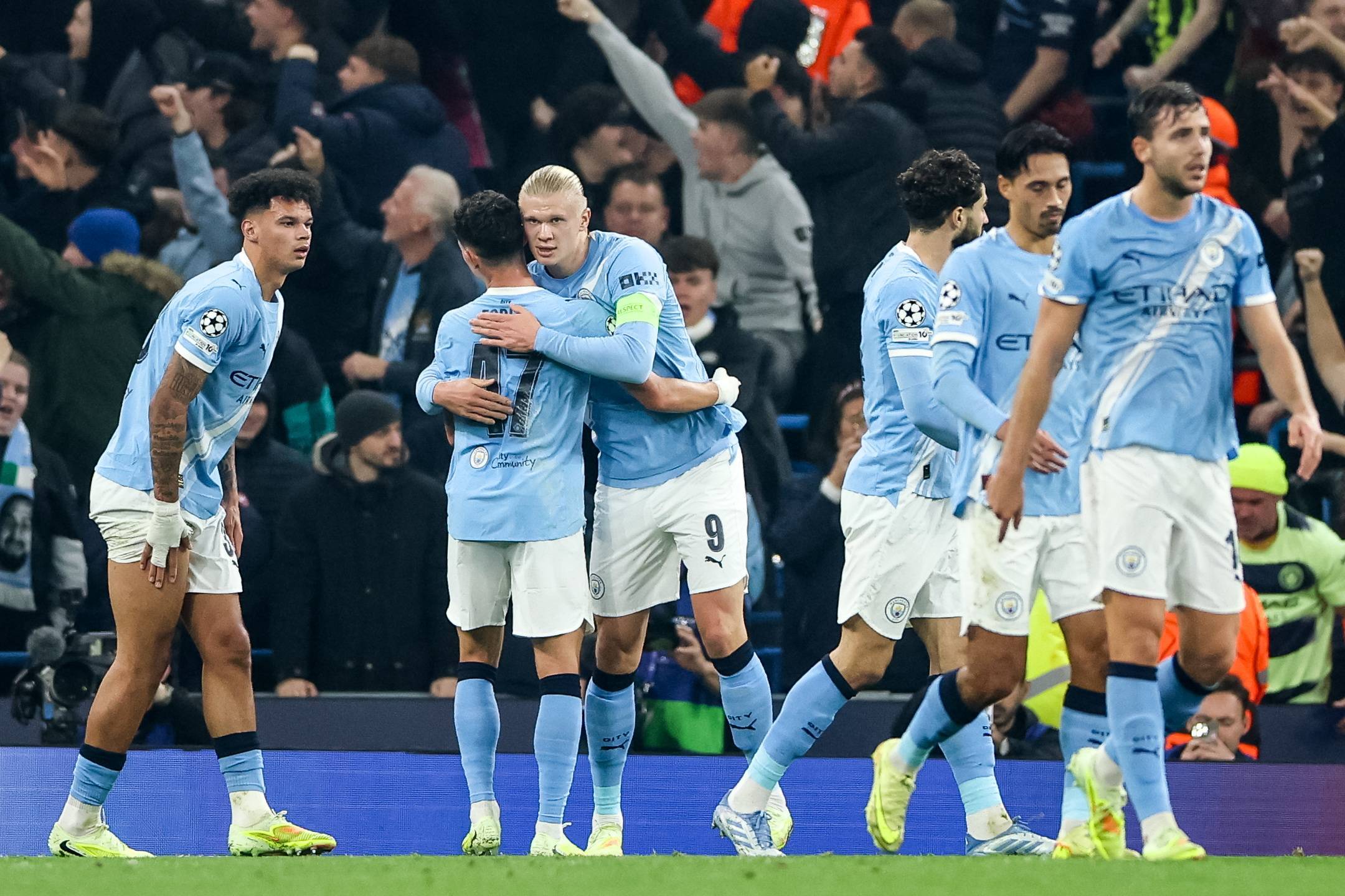 เมื่อวันที่ 5 พฤศจิกายน เออร์ลิง ฮาแลนด์ (ซ้าย) นักเตะแมนเชสเตอร์ ซิตี้ ฉลองการทำประตูที่สองของทีม Xinhua/EPA