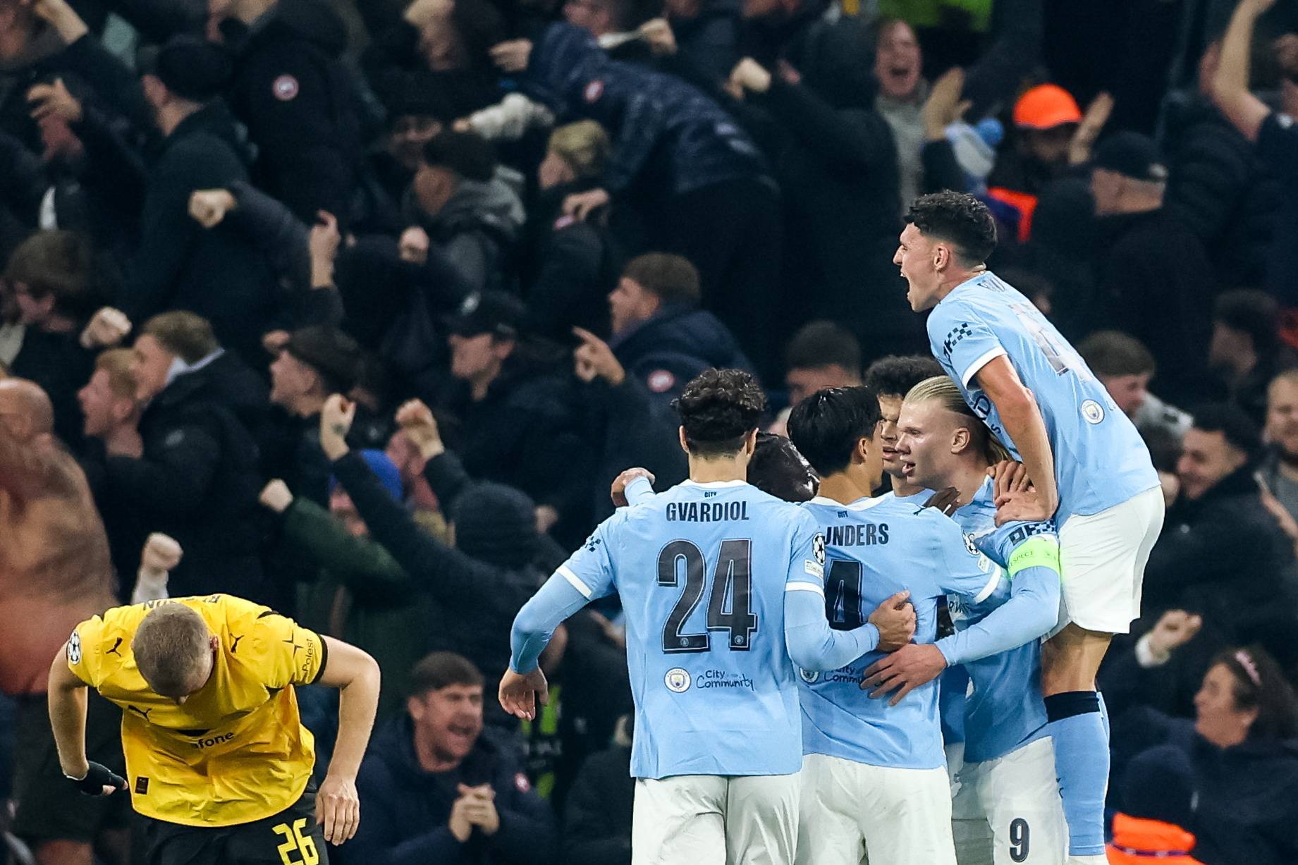 เมื่อวันที่ 5 พฤศจิกายน เออร์ลิ่ง ฮาแลนด์ (คนที่สองจากขวา) นักเตะแมนเชสเตอร์ ซิตี้ ฉลองการทำประตูที่สองของทีม Xinhua/EPA