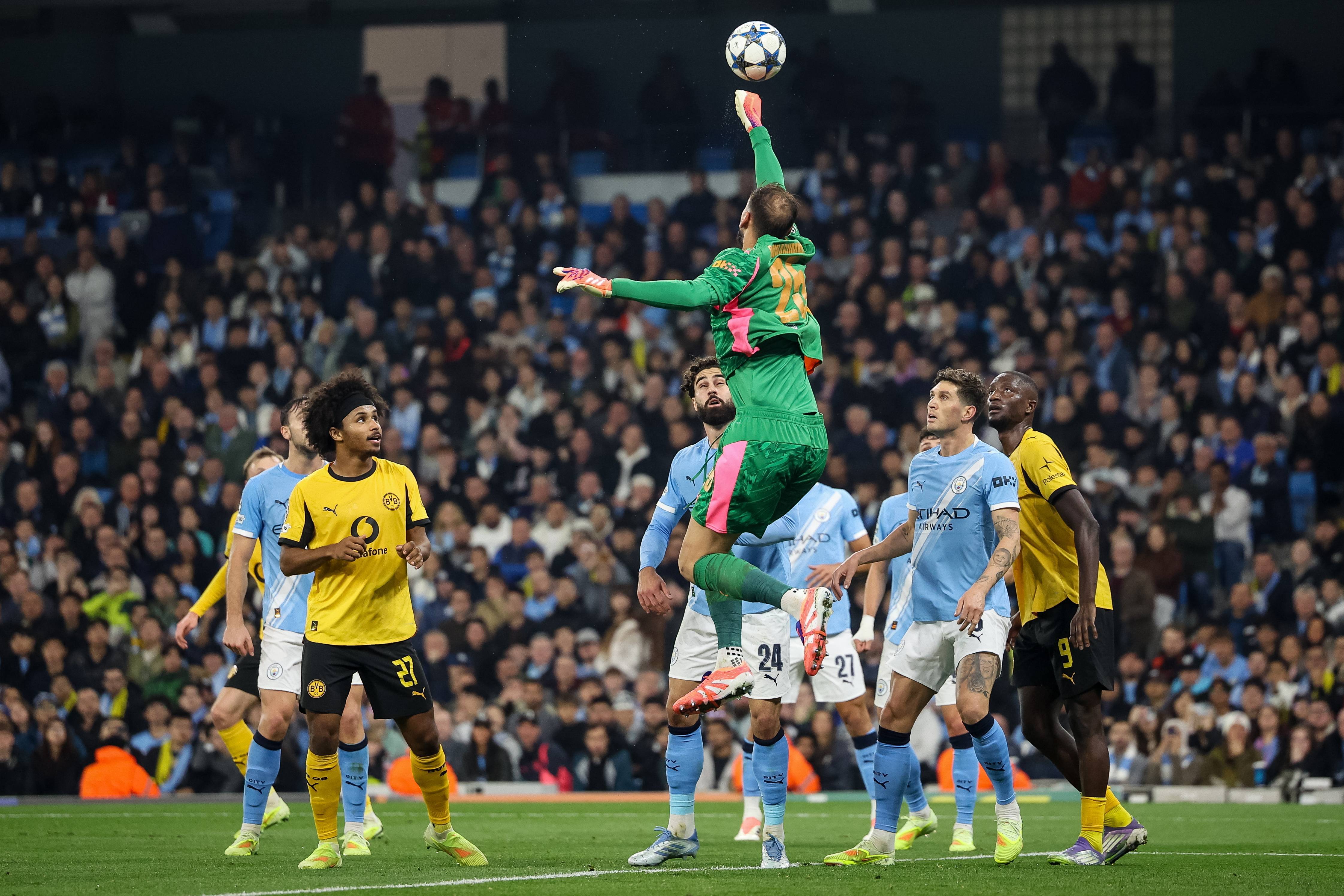 เมื่อวันที่ 5 พฤศจิกายน ผู้รักษาประตูของแมนเชสเตอร์ ซิตี้ จานลุยจิ ดอนนารุมมา (กลาง) ทำการเซฟลูกบอล. ชินหัว/อีพีเอ