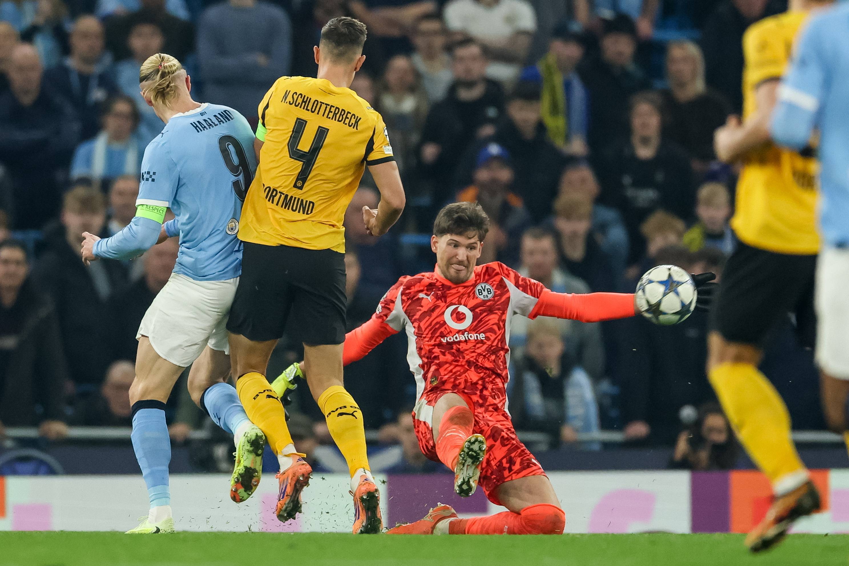 เมื่อวันที่ 5 พฤศจิกายน เออร์ลิง ฮาแลนด์ (ซ้าย) ของแมนเชสเตอร์ ซิตี้ ท้าทายโรมัน บือร์กิ (ขวา) ผู้รักษาประตูของโบรุสเซีย ดอร์ทมุนด์ เพื่อแย่งบอล. ซินหัว/อีพีเอ