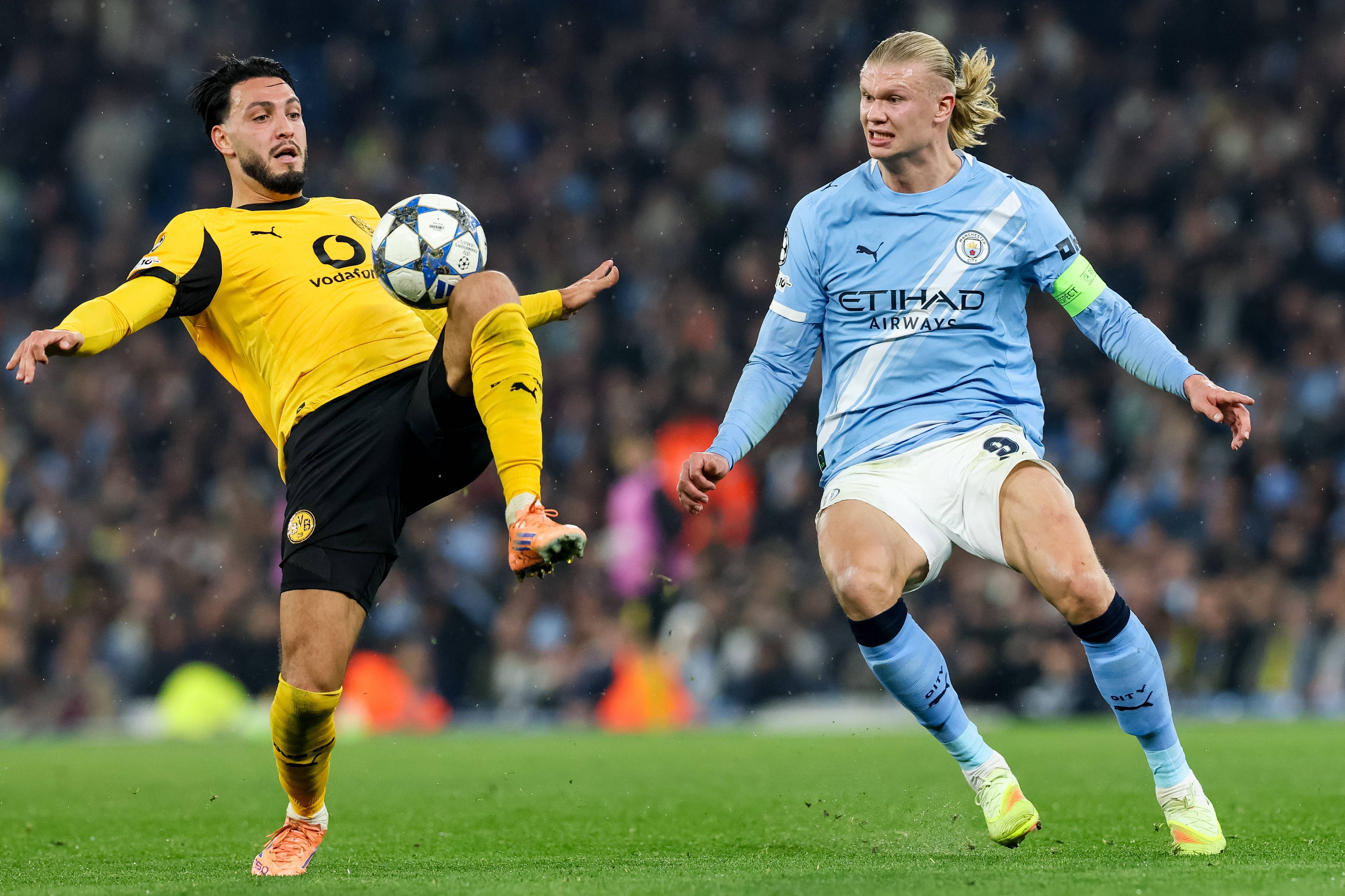 เมื่อวันที่ 5 พฤศจิกายน เออร์ลิง ฮาแลนด์ ของแมนเชสเตอร์ ซิตี้ (ขวา) ท้าทาย อิบราฮิมา เบนเซบายนี ของโบรุสเซีย ดอร์ทมุนด์ ระหว่างการแข่งขัน ซินหัว/EPA