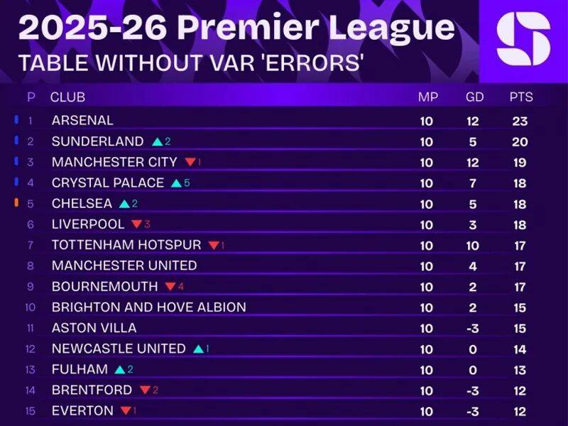 น่าสนใจที่เว็บไซต์วิเคราะห์ข้อมูลชื่อดัง Squawka ได้จัดทำตารางลีกโดยไม่นับรวมการตัดสินที่มีข้อพิพาทจาก VAR ซึ่งอาร์เซนอลยังคงครองอันดับหนึ่ง และซันเดอร์แลนด์ขยับขึ้นมาอยู่อันดับสอง แมนเชสเตอร์ ยูไนเต็ด เป็นหนึ่งในไม่กี่ทีมที่อันดับไม่เปลี่ยนแปลง นี่อาจบ่งชี้ว่าซันเดอร์แลนด์เผชิญกับการตัดสินของกรรมการที่ไม่เป็นธรรมมากกว่าหรือไม่?
