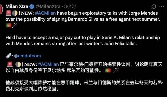 ซิลวาของแมนเชสเตอร์ ซิตี้! เอซี มิลานกำลังจับตาดูอนาคตของกองกลางชาวโปรตุเกสอย่างใกล้ชิด โดยรอสโซเนรีเตรียมเริ่มการเจรจากับเมนเดสเกี่ยวกับความเป็นไปได้ที่แบร์นาร์โดจะย้ายไปมิลานในช่วงตลาดซื้อขายนักเตะซัมเมอร์หน้า ส่วนตัวแล้ว ผมเชื่อว่าความเป็นไปได้ที่ซิลวาจะย้ายไปมิลานนั้นไม่ต้องถกเถียงกันอีกแล้ว - ประเด็นสำคัญคือเงินเดือนของเขา หากเขายอมรับการลดค่าจ้าง การย้ายไปมิลานของเขาจะเป็นการเปลี่ยนแปลงเกม