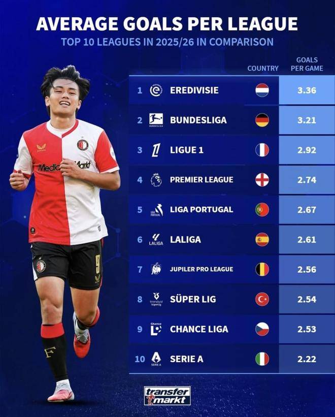 เฉลี่ยนจำนวนประตูต่อเกมของลีกยุโรปถูกเปิดเผย! เซเรียอาทำประตูน้อยกว่าลีกเล็ก ๆ อยู่ในอันดับสุดท้ายของตาราง แหล่งข้อมูล: การจัดอันดับลีก