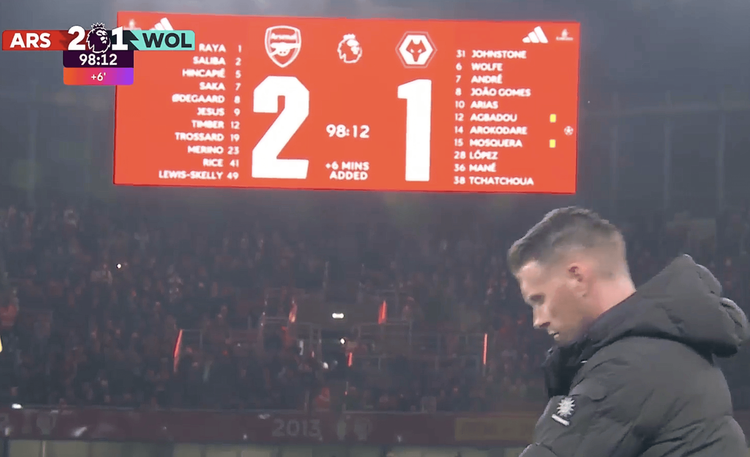 อย่างไรก็ตาม นักเตะของวูล์ฟส์ดูเหมือนจะไม่สามารถทนเห็นอาร์เซนอลทำแต้มหล่นได้ ในนาทีที่ 94 พวกเขา 'ใจดี' มอบประตูตัวเองอีกครั้ง ซาก้าเปิดบอลจากฝั่งขวา และกองหลังของวูล์ฟส์โหม่งสกัดออกไป – แต่กลับส่งบอลเข้าประตูตัวเอง ใช่แล้ว วูล์ฟส์ได้ปิดฉากความพ่ายแพ้ของตัวเอง! ขอบคุณสองประตูตัวเองจากคู่แข่ง อาร์เซนอลคว้าสามแต้มไปได้อย่างดราม่าที่สุด