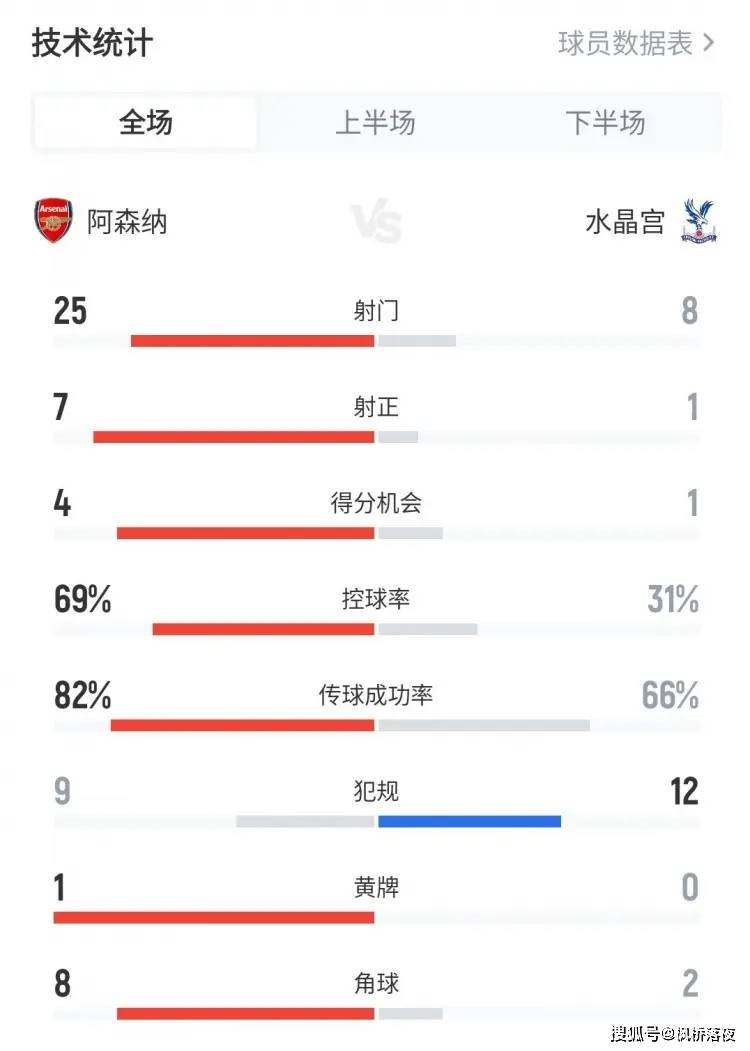 สถิติการแข่งขันเผยให้เห็นถึงความเหนือชั้นของอาร์เซนอลควบคู่กับปัญหาด้านประสิทธิภาพ ทีมปืนใหญ่สร้างโอกาสทำประตูที่ชัดเจนได้ถึงสี่ครั้งตลอดทั้งเกม ขณะที่คริสตัล พาเลซทำได้เพียงครั้งเดียว ในแง่ของอัตราการผ่านบอลสำเร็จ อาร์เซนอลทำได้ถึง 82% ซึ่งเหนือกว่าพาเลซที่ทำได้เพียง 66% อย่างมาก