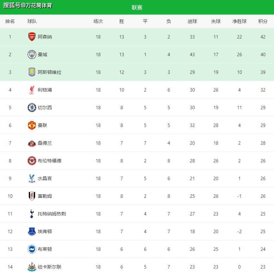 เมื่อดูจากอันดับโดยรวม การแข่งขันในรอบนี้ส่งผลกระทบอย่างมากต่อทิศทางของพรีเมียร์ลีก อาร์เซนอลยังคงรั้งตำแหน่งจ่าฝูงด้วย 42 คะแนน แม้จะไม่ได้ทิ้งห่างมากนัก แมนเชสเตอร์ ซิตี้ ตามมาติดๆ ด้วย 40 คะแนน ขณะที่แอสตัน วิลล่าก็เก็บได้ 39 คะแนนเช่นกัน เมื่อสามทีมนำมีคะแนนห่างกันเพียงสามแต้ม การแข่งขันชิงแชมป์จึงกลายเป็นศึกสามทีมอย่างชัดเจน