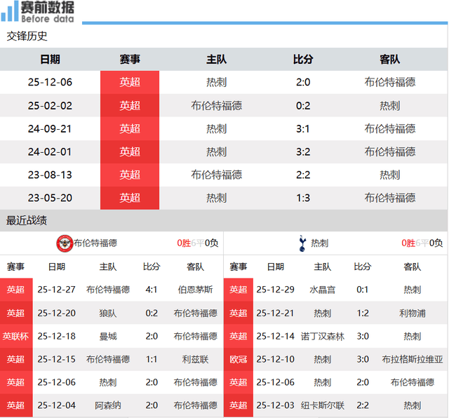 เวลา 04:00 น. ตามเวลาปักกิ่ง วันที่ 2 มกราคม เบรนท์ฟอร์ดเปิดบ้านต้อนรับท็อตแน่ม ฮ็อทสเปอร์ ในรอบที่ 19 ของพรีเมียร์ลีก