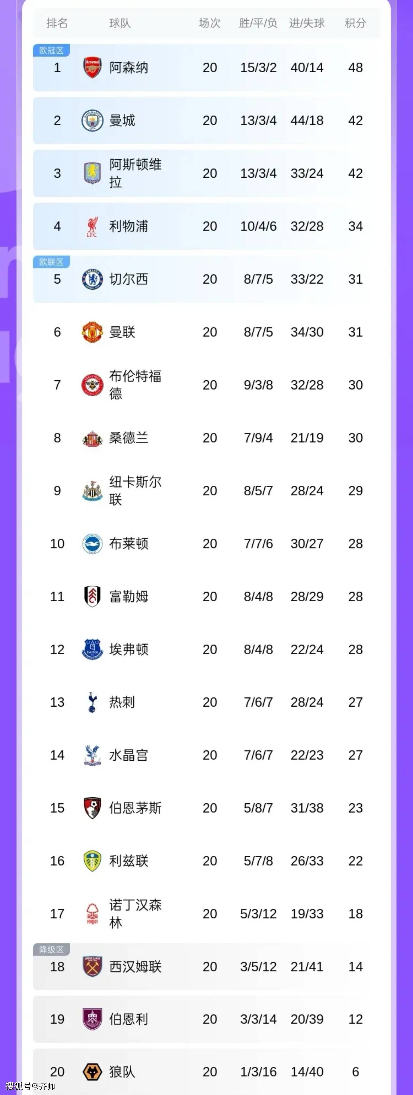 อันดับปัจจุบันของพรีเมียร์ลีก: อาร์เซนอลนำเป็นจ่าฝูง โดยมีแมนเชสเตอร์ ซิตี้อยู่ในอันดับสอง แอสตัน วิลล่าและลิเวอร์พูลครองอันดับสามและสี่ตามลำดับ ขณะที่เชลซีและแมนเชสเตอร์ ซิตี้อยู่ในอันดับห้าและหก ในโซนตกชั้น: เวสต์แฮม ยูไนเต็ด, เบิร์นลีย์ และวูล์ฟแฮมป์ตัน วันเดอเรอร์ส อยู่ในอันดับที่ 18, 19 และ 20 ตามลำดับ