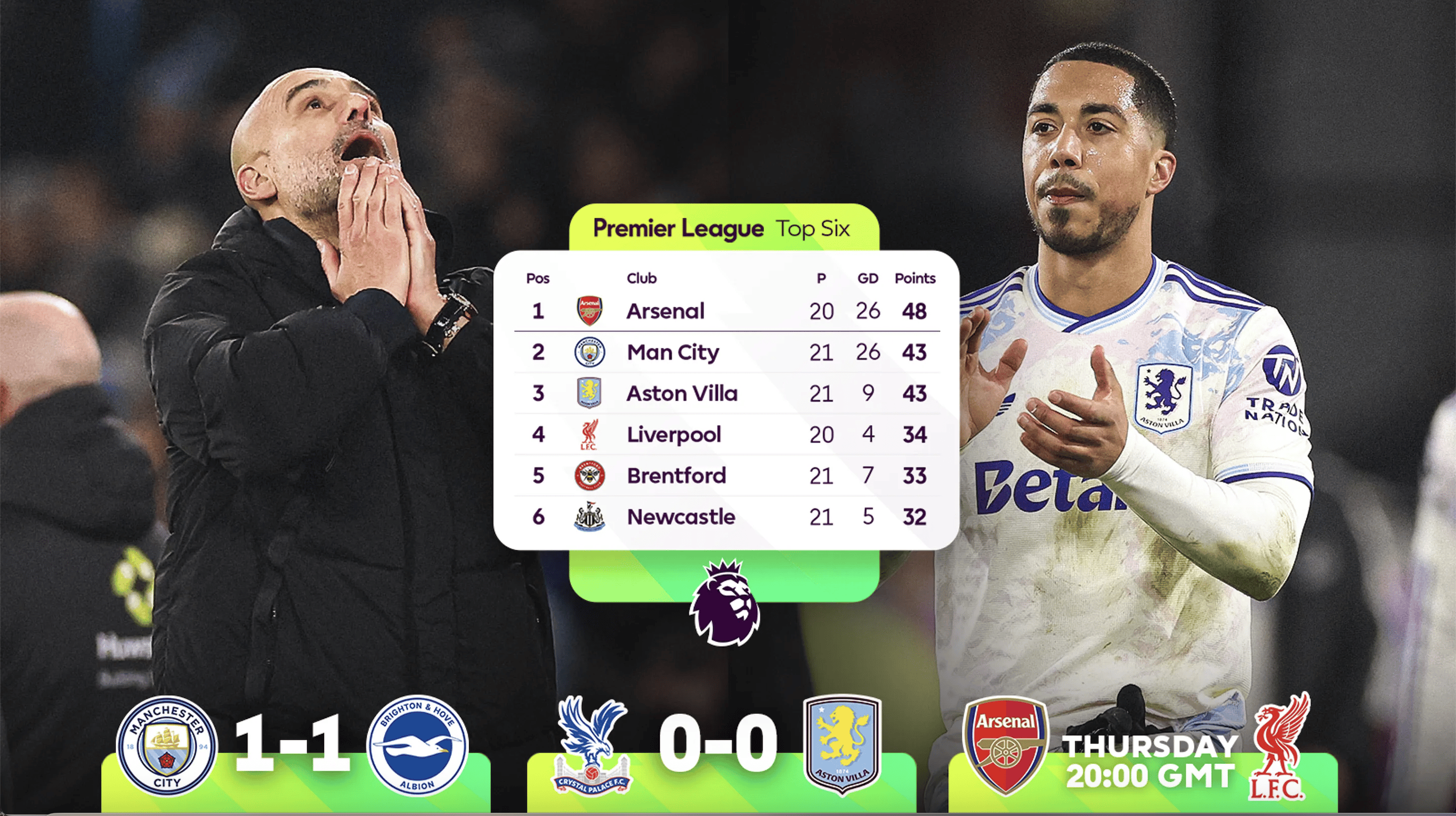 สรุปผลพรีเมียร์ลีก | แมนเชสเตอร์ ซิตี้ และ แอสตัน วิลล่า เสมอกัน; อาร์เซนอลพร้อมที่จะขยายการนำที่จ่าฝูง _การแข่งขัน_ แมนเชสเตอร์ ยูไนเต็ด ลิเวอร์พูล