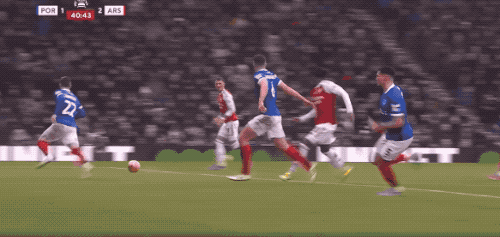 ในนาทีที่ 40 เบน ไวท์ เปิดบอลจากเส้นหลัง บอลลอยข้ามแนวรับทั้งหมด แต่ลูกยิงของมาร์ติเนลลี่ไปชนเสา