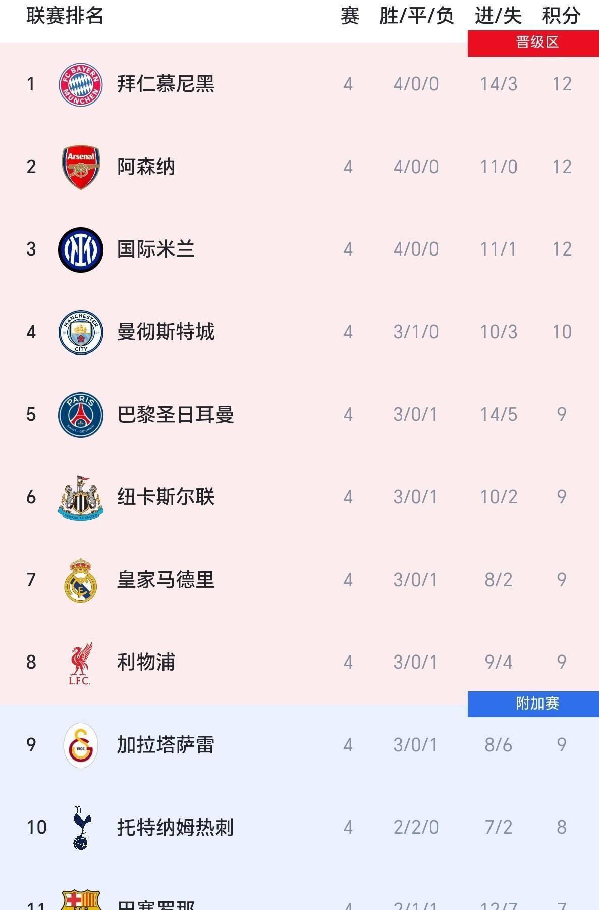 บาเยิร์น มิวนิก, อาร์เซนอล และ อินเตอร์ มิลาน สามสโมสรชั้นนำของยุโรป นำเป็นจ่าฝูงด้วยคะแนน 12 คะแนนเท่ากันหลังจากชนะติดต่อกันสี่นัด