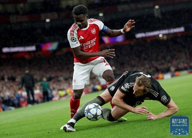 บูคาโย ซาก้า ของอาร์เซนอล (ด้านบน) ต่อสู้เพื่อแย่งบอลกับ แฮร์รี่ เคน ของบาเยิร์น มิวนิค