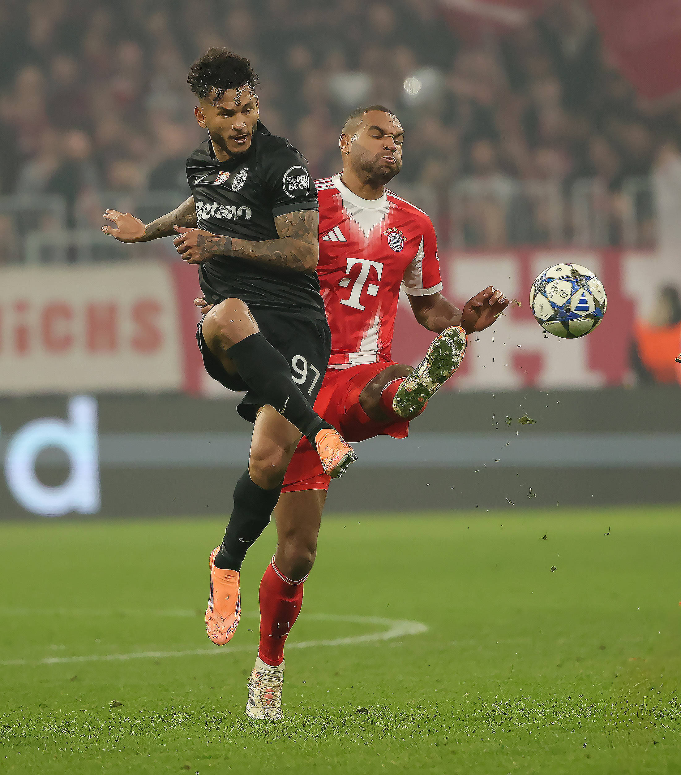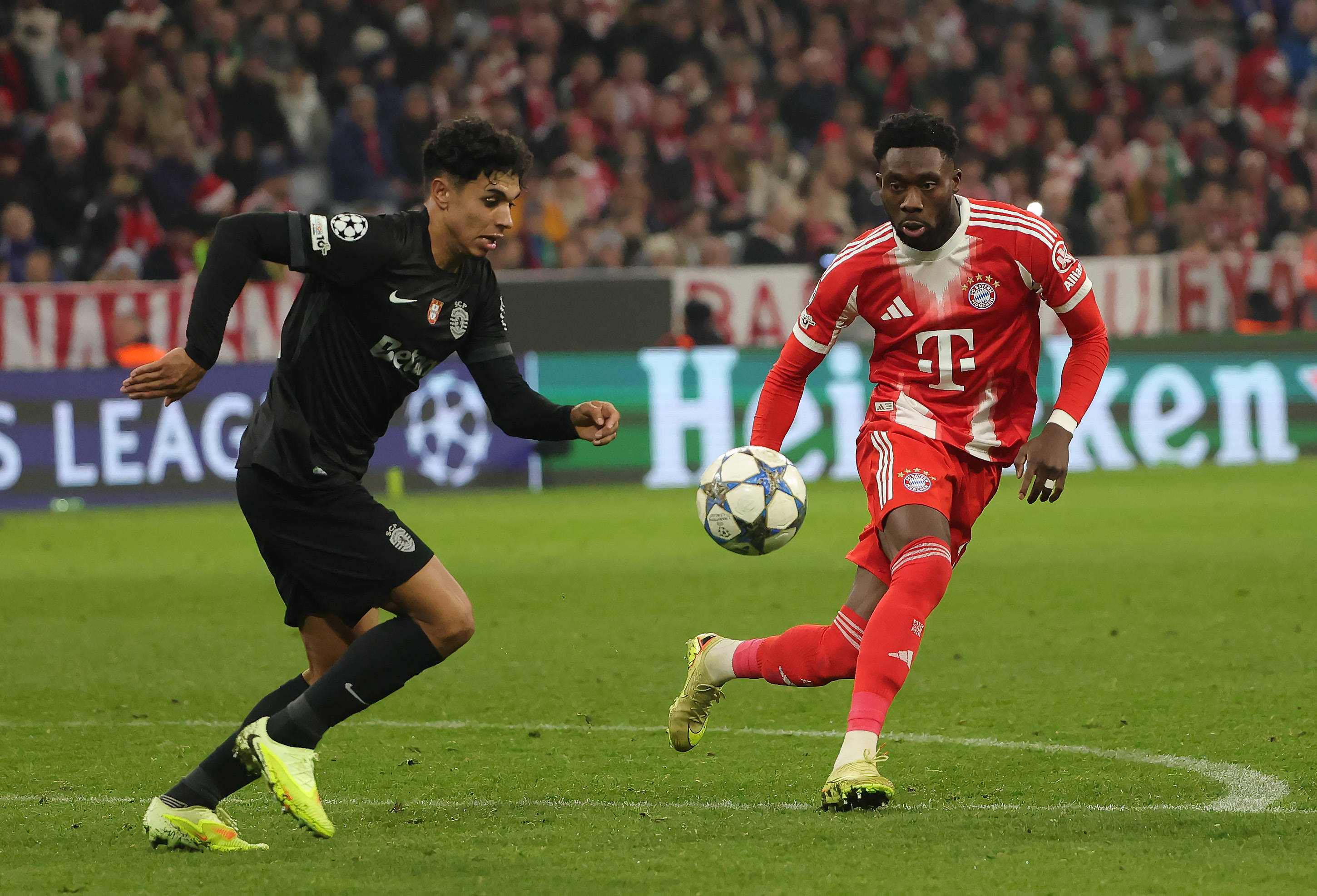 เมื่อวันที่ 9 ธันวาคม เดวีส์ (ขวา) ของบาเยิร์น มิวนิก และซิเมโอเนส ของสปอร์ติง ลิสบอน ต่อสู้เพื่อแย่งบอลในระหว่างการแข่งขัน สำนักข่าวซินหัว (ภาพโดย ฟิลิปป์ รุยซ์)