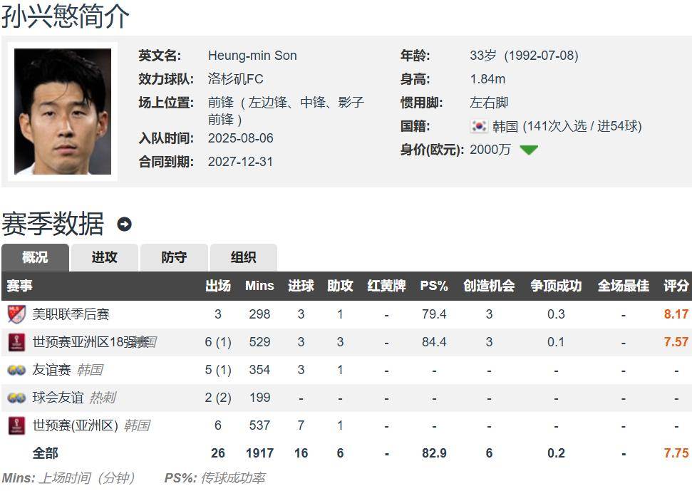 ซน ฮึง-มิน อายุ 33 ปี สูง 1.84 เมตร เป็นผู้เล่นที่ถนัดทั้งสองเท้า โดยส่วนใหญ่เล่นในตำแหน่งปีกซ้าย สัญญาของเขากับลอสแอนเจลิส เอฟซี จะสิ้นสุดลงในช่วงปลายเดือนธันวาคม 2027 โดย Transfermarkt ประเมินมูลค่าเขาไว้ที่ 20 ล้านยูโรซนยังคงรักษามาตรฐานอันยอดเยี่ยมของเขาจากพรีเมียร์ลีกสู่ MLS โดยลงเล่นให้กับ LA FC ในทุกรายการ 13 นัดในครึ่งฤดูกาลนี้ ยิงได้ 12 ประตูและทำ 4 แอสซิสต์ LA FC ถูกคัดออกในรอบก่อนรองชนะเลิศของ MLS Cup Playoff โดยทีม Vancouver Whitecaps ที่นำโดยมุลเลอร์!