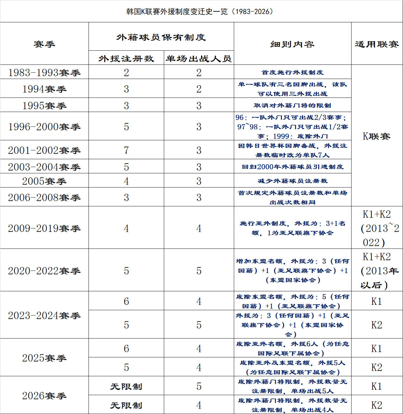 เมื่อพูดถึงประวัติของผู้รักษาประตูชาวต่างชาติในลีกเกาหลี K League เราต้องเข้าใจก่อนถึงวิวัฒนาการของกฎระเบียบเกี่ยวกับผู้เล่นชาวต่างชาติของลีกตั้งแต่ปี 1983 ตามที่แสดงไว้ด้านล่าง: