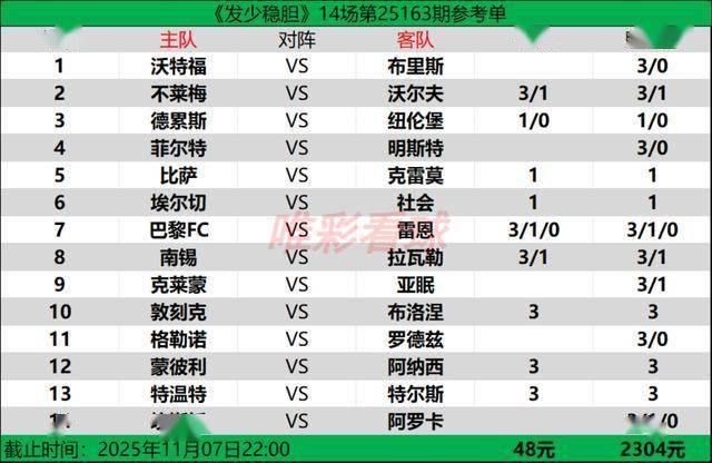 การคัดเลือกการเดิมพัน 14 แมตช์ในสัปดาห์นี้ประกอบด้วยการแข่งขันจาก English Championship (1 แมตช์), Bundesliga (1 แมตช์), 2. Bundesliga (2 แมตช์), Serie A (1 แมตช์), La Liga (1 แมตช์), Ligue 1 (1 แมตช์), Ligue 2 (4 แมตช์), Eredivisie (1 แมตช์) และ Primeira Liga (1 แมตช์)การเดิมพันในวันศุกร์ยังคงมีการแข่งขันที่หลากหลายเช่นเคย รอบนี้มีการทำนายผลการแข่งขัน 14 คู่ ซึ่งมีความยากลำบากอย่างมาก เนื่องจากมีตัวเลือกที่น่าเชื่อถือน้อยลง และทีมที่มีระดับใกล้เคียงกันในลีกต่ำ ซึ่งเพิ่มความไม่แน่นอนให้มากขึ้น เมื่อรวมกับจำนวนการแข่งขันที่พลิกโผอย่างมากใน 14 คู่เมื่อวานนี้ ทำให้ยอดเงินสะสมในรอบนี้เพิ่มขึ้นถึง 2.43 ล้านหยวน ซึ่งบ่งชี้ว่าเงินรางวัลสำหรับการทำนายผลในรอบนี้จะมีจำนวนมาก จึงจำเป็นต้องตรวจสอบอย่างละเอียดเมื่อเลือกตัวเลือกที่สำคัญ
