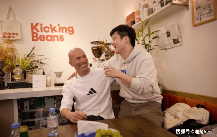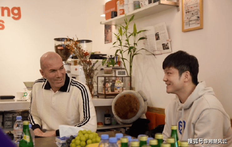 สองยอดนักกีฬาพบกัน: ฟาน เจ๋อดง ยิ้มอย่างมีความสุข ผ่อนคลายอย่างเต็มที่ ขณะที่ซีดานมองเขาด้วยความชื่นชม ลีกแชมเปียนส์เทเบิลเทนนิส เรอัล มาดริด