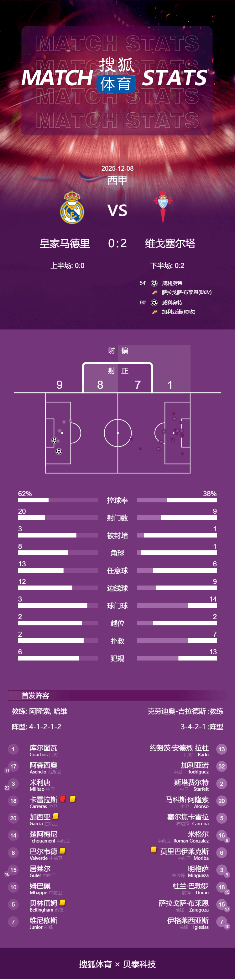 เวลา 04:00 น. ของวันที่ 8 ธันวาคม 2568 การแข่งขันนัดสำคัญในรอบที่ 15 ของฤดูกาล ลาลีกา 2025-2026 ได้เริ่มต้นขึ้น โดยเรอัล มาดริด เปิดบ้านรับการมาเยือนของเซลตา บีโก้ ครึ่งแรกจบลงด้วยสกอร์ 0-0 ในครึ่งหลัง ซาราโกซาเป็นผู้จ่ายบอลให้สเวดเบิร์กทำประตูเบิกร่องฟราน การ์เซีย ได้รับใบเหลืองที่สองจากการทำฟาวล์และถูกไล่ออกจากสนาม จากนั้น คาร์เรราสได้ประท้วงการตัดสินของผู้ตัดสินและได้รับใบเหลืองติดต่อกันจนถูกไล่ออกเช่นกัน ในช่วงทดเวลาบาดเจ็บ อัสปาสทำแอสซิสต์ให้สเวดเบิร์กยิงประตูชัย ในที่สุด เรอัล มาดริด พ่ายแพ้คาบ้านต่อเซลต้า บีโก้ 0-2 ทำให้ช่องว่างกับบาร์เซโลนาในตารางคะแนนลาลีกาเพิ่มขึ้นเป็นสี่แต้ม