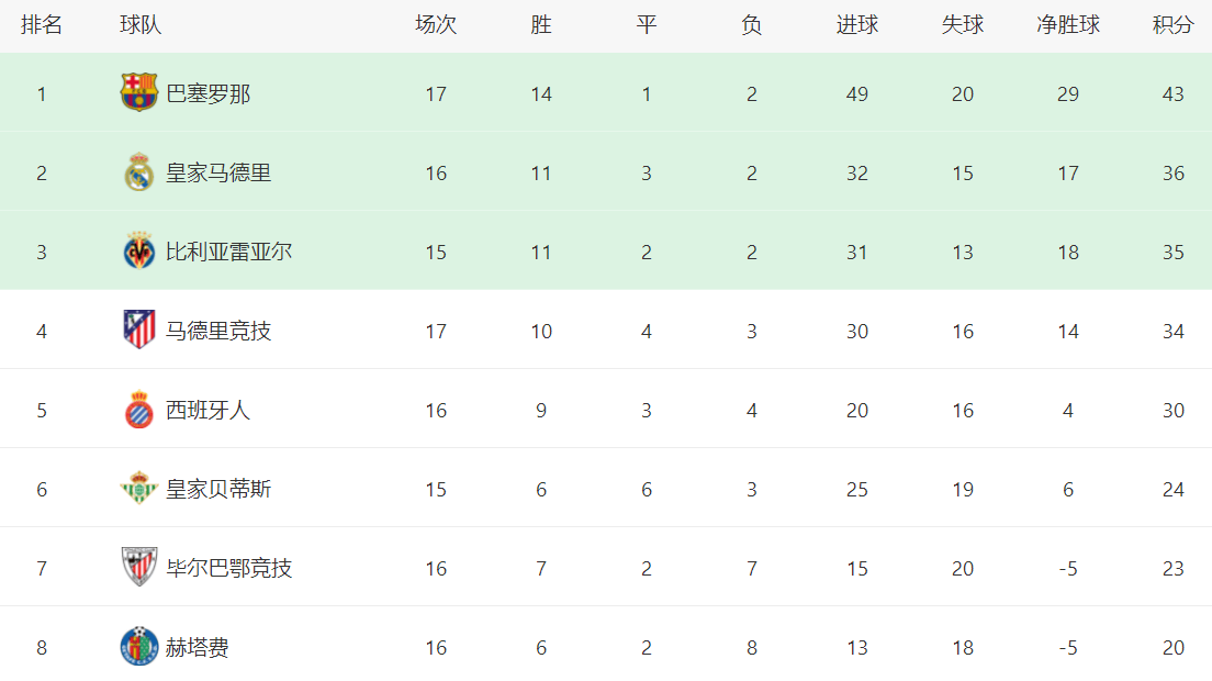ในตารางลีก บาร์เซโลนาครองตำแหน่งจ่าฝูงด้วย 43 คะแนน จาก 14 ชนะ 1 เสมอ และ 2 แพ้ เรอัล มาดริด ตามมาเป็นอันดับสองด้วย 36 คะแนน ตามหลังบาร์ซาอยู่ 7 คะแนนเต็ม แม้ว่าพวกเขาจะเล่นน้อยกว่า 1 นัดก็ตาม บียาร์เรอัล ครองอันดับสามด้วย 35 คะแนน ขณะที่แอตเลติโก มาดริด อยู่ในอันดับสี่ด้วย 34 คะแนนเอสปันญอล ทีมเซอร์ไพรส์ของฤดูกาล ทำผลงานได้อย่างยอดเยี่ยม เก็บได้ 30 คะแนน อยู่อันดับ 5 ตามหลังแอตเลติโกเพียง 4 คะแนนเท่านั้น ซึ่งถือเป็นคะแนนสูงสุดในประวัติศาสตร์ของสโมสรในขั้นตอนนี้ของฤดูกาล เรอัล เบติส อยู่อันดับ 6 มี 24 คะแนน