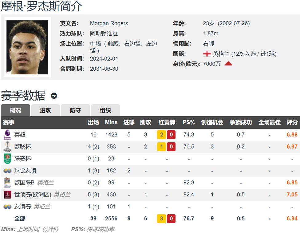โรเจอร์ส อายุ 23 ปี สูง 1.87 เมตร เป็นผู้เล่นถนัดเท้าขวาที่เล่นในตำแหน่งกองกลางตัวรุกเป็นหลัก สัญญาของเขากับแอสตัน วิลล่า หมดอายุในปี 2031 โดย Transfermarkt ประเมินมูลค่าเขาไว้ที่ 70 ล้านยูโร หลังจากลงเล่นให้ทีมชาติอังกฤษไปแล้ว 12 นัด เขาจึงเป็นผู้เล่นที่มีศักยภาพสูงในการติดทีมชาติอังกฤษชุดฟุตบอลโลกปี 2026 โดยการจัดอันดับทางแท็คติกของเขาภายใต้การคุมทีมของทูเคิลยังสูงกว่าเบลลิงแฮมอีกด้วยโรเจอร์สทำประตูได้สองครั้งในนัดนี้ของพรีเมียร์ลีก ช่วยให้แอสตัน วิลล่าพลิกกลับมาเอาชนะเวสต์แฮม ยูไนเต็ด 3-2 ในเกมเยือน นัดนี้ถือเป็นชัยชนะครั้งที่สิบของวิลล่าในสิบเอ็ดนัดล่าสุดของพรีเมียร์ลีก ในทุกรายการฤดูกาลนี้ โรเจอร์สมีส่วนร่วมกับทีมด้วยการทำประตูห้าครั้งและแอสซิสต์ห้าครั้งใน 23 นัด แอสตัน วิลล่าอยู่ในอันดับที่สามของตารางพรีเมียร์ลีก และยังคงเป็นผู้ท้าชิงสำคัญทั้งในพรีเมียร์ลีกและยูโรปาลีก