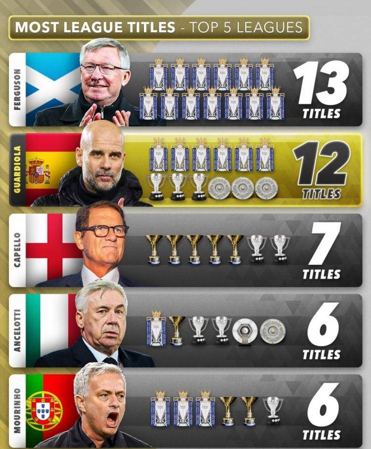 เมื่อเปรียบเทียบกับความสำเร็จในลีกภายในประเทศของเขา ผลงานที่น่าประทับใจที่สุดของอันเชล็อตติอยู่ในแชมเปียนส์ลีก แม้ว่าจำนวนแชมป์ลีกของเขาอาจไม่ได้โดดเด่นเป็นพิเศษ แต่การได้อยู่ในอันดับห้าอันดับแรกก็ยังถือเป็นความสำเร็จที่น่าทึ่งอย่างยิ่งในที่สุด อันดับที่ห้าคือ 'เดอะ สเปเชียล วัน' โชเซ่ มูรินโญ่ อาชีพการเป็นผู้จัดการทีมของมูรินโญ่ก็มีความโดดเด่นเช่นกัน โดยคว้าแชมป์ลีกมาแล้วหกสมัย ซึ่งรวมถึงแชมป์พรีเมียร์ลีกสามสมัย, แชมป์เซเรียอาสองสมัย และแชมป์ลาลีกาหนึ่งสมัย การก้าวขึ้นสู่จุดสูงสุดของมูรินโญ่เกิดขึ้นในช่วงต้นถึงกลางอาชีพของเขา ซึ่งเป็นช่วงเวลาที่เขาเติมเต็มตู้ถ้วยรางวัลของเขาอย่างรวดเร็ว