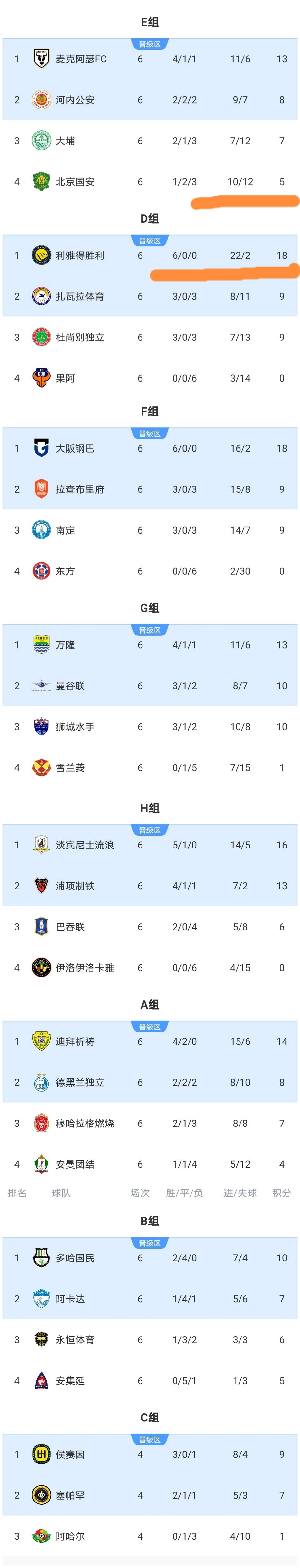 อัปเดตอันดับ: ตามกฎเริ่มต้น ทีมอันดับสูงสุดสองทีมจากแต่ละกลุ่มจะผ่านเข้าสู่รอบน็อคเอาท์ ทีมปักกิ่ง กัวอัน จากกลุ่ม E จบอันดับสุดท้ายและถูกคัดออก ขณะที่ทีมไท่ผ่อ และทีมอีสเทิร์น จากฮ่องกงก็ไม่สามารถผ่านเข้ารอบได้เช่นกัน อันที่จริง ทีมจากจีนทั้งหมดถูกคัดออกแล้ว ในกลุ่ม D ทีมอัล นาสเซอร์ ครองอันดับสูงสุดด้วยคะแนน 18 คะแนน ขณะที่ทีมกัมบะ โอซาก้า จากญี่ปุ่น และทีมโพฮัง สตีลเลอร์ส จากเกาหลีใต้ ก็ผ่านเข้ารอบจากกลุ่มของพวกเขาได้เช่นกัน