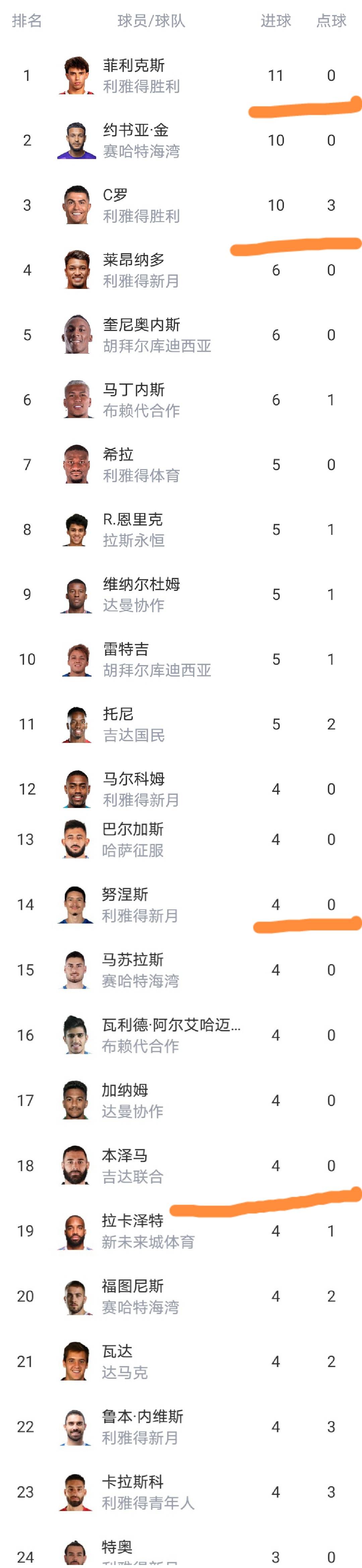 อันดับดาวซัลโวสูงสุดล่าสุดของซาอุดิ โปร ลีก: ตามที่เห็น เฟลิกซ์นำเป็นดาวซัลโวสูงสุดด้วย 11 ประตู มากกว่าคริสเตียโน โรนัลโด 1 ประตู โรนัลโดอยู่ในอันดับที่สาม เนื่องจากเขาทำประตูจากการยิงจุดโทษได้ 3 ครั้ง ขณะที่โจชัวยังไม่ได้ยิงจุดโทษเลย จึงอยู่ในอันดับที่สอง นูเนซและเบนเซม่าต่างทำประตูได้ 4 ประตูรายชื่อผู้ทำประตูสูงสุดของซาอุดิ โปร ลีก มีอดีตนักเตะชื่อดังจากลีกชั้นนำ 5 อันดับแรกของยุโรปมากมาย สะท้อนให้เห็นถึงการแข่งขันที่ดุเดือดเพื่อชิงตำแหน่งดาวซัลโวสูงสุดของลีก
