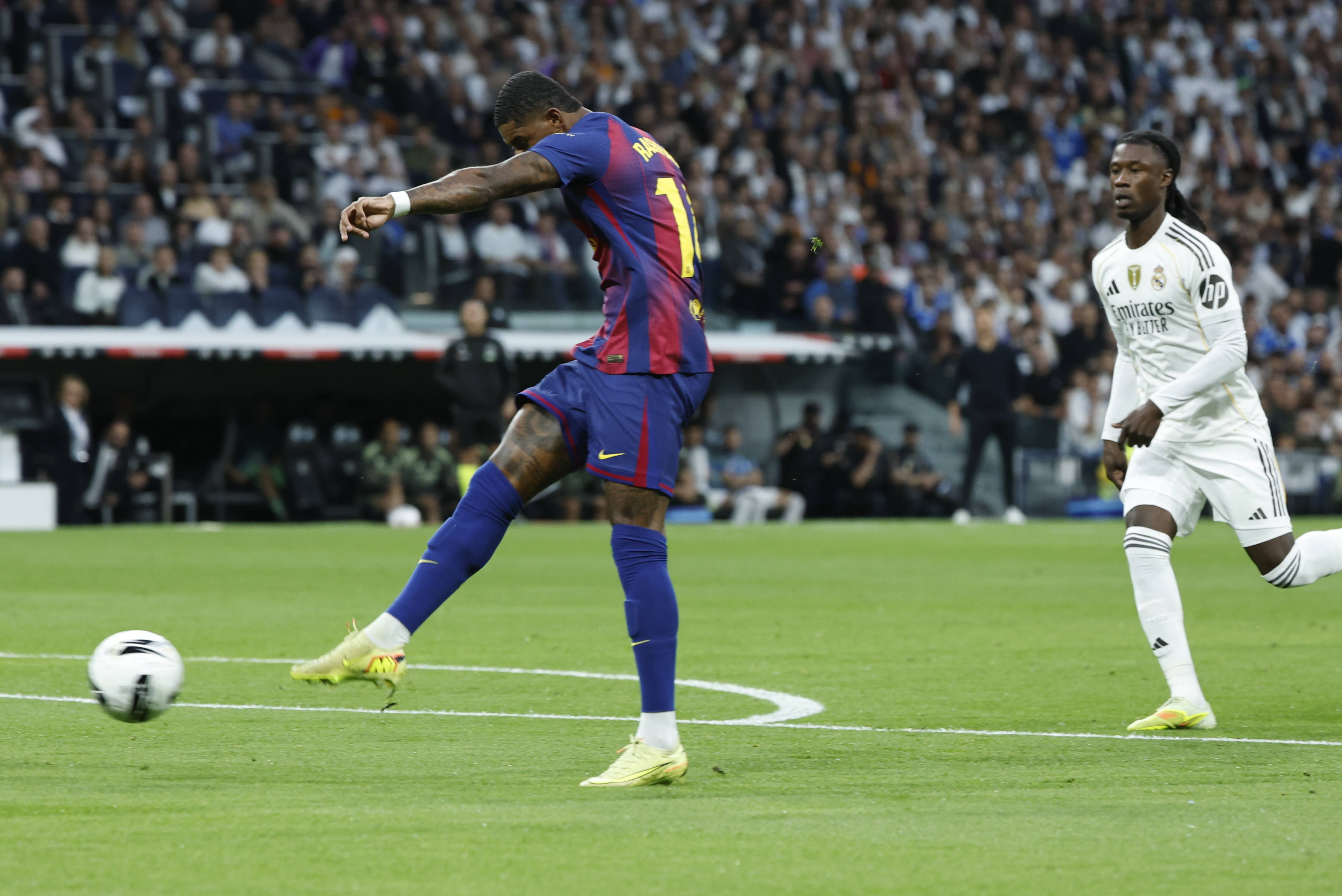 เมื่อวันที่ 26 ตุลาคม วินิซิอุสของเรอัล มาดริด (ขวา) เข้าแย่งบอลกับเดอ ยองของบาร์เซโลนา ซีเอ็นเอ/อีพีเอ