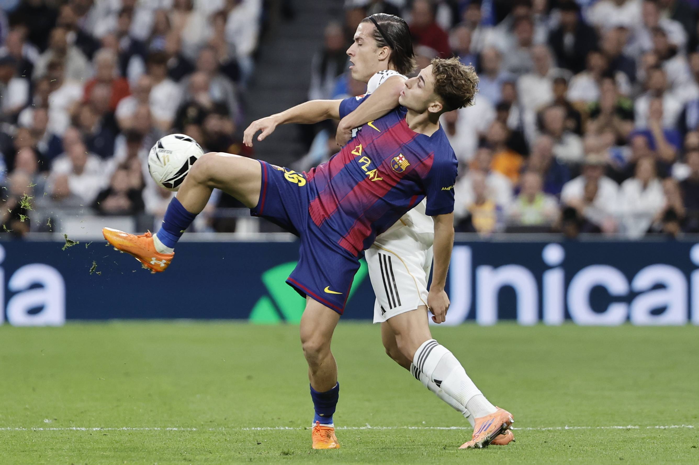 เมื่อวันที่ 26 ตุลาคม เอดูอาร์โด้ กามาวินก้า ของเรอัล มาดริด (ขวา) เข้าแย่งบอลกับ เปดรี ของบาร์เซโลนา ซีนา/EPA
