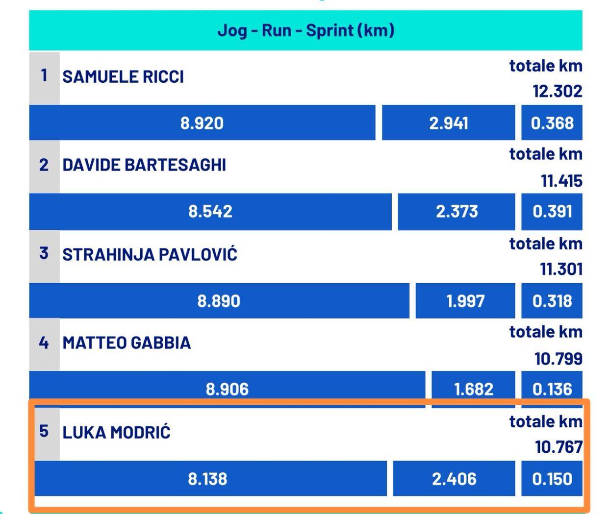 แม้จะเป็นการแข่งขันที่หนักหน่วง แต่ลูก้า โมดริช ยังคงวิ่งได้ถึง 10.8 กิโลเมตร ซึ่งอยู่ในอันดับที่ห้าของเพื่อนร่วมทีมและอันดับที่เจ็ดโดยรวม นอกจากนี้ เขายังทำการสกัดบอลได้มากที่สุดในสนามถึงสามครั้ง พร้อมกับสองการเข้าปะทะและหนึ่งการเคลียร์บอล ดัชนีการผ่านบอลทะลุแนวรับของเขายังอยู่ในอันดับที่สองของทีมอีกด้วย