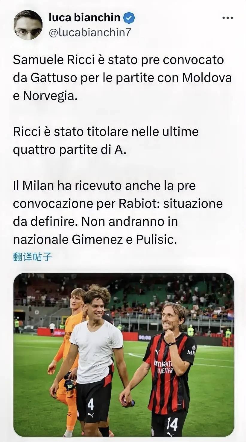รายงานระบุว่า เอซี มิลาน ก็ได้รับแจ้งเช่นกันเกี่ยวกับการเรียกตัว ริชชี่ เข้าร่วมทีมชาติอิตาลีอย่างไรก็ตาม สโมสรยังคงมีความสงบภายในอยู่มาก โดยแทบไม่มีการให้ความสนใจกับการเรียกตัวของริชชี่เลย ซึ่งก็เป็นเรื่องที่เข้าใจได้เมื่อพิจารณาว่าในช่วงพักเบรกทีมชาติครั้งก่อน มิลานเอลโลแทบจะร้างผู้คน เหลือเพียงนักเตะที่บาดเจ็บเท่านั้น เนื่องจากส่วนใหญ่ต้องไปรับใช้ทีมชาติ ทีมชาติอิตาลีชุดปัจจุบันก็ไม่สามารถสร้างความสนใจได้มากนัก โดยเฉพาะเมื่อเทียบกับทีมเมื่อสิบปีก่อนหรือมากกว่านั้น หากสหพันธ์ฟุตบอลอิตาลีไม่ปรับเปลี่ยนอย่างมีนัยสำคัญ ทีมชาติอิตาลีอาจเสี่ยงที่จะกลายเป็นทีมระดับรองของยุโรป
