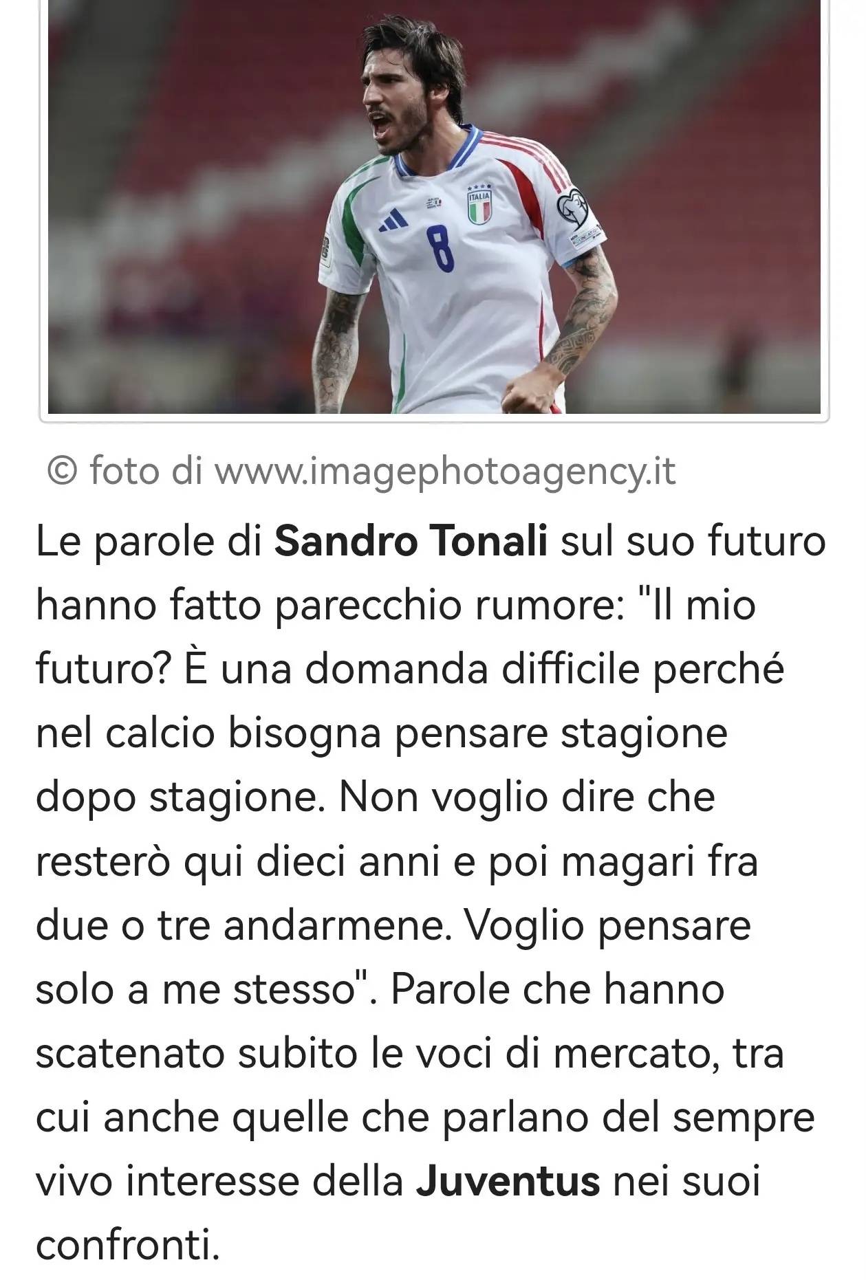 คำพูดของแซนโดร โตนาลีเกี่ยวกับอนาคตของเขาได้จุดประกายการถกเถียงอย่างมาก: "อนาคตของผมเหรอ? นั่นเป็นคำถามที่ตอบยาก เพราะในวงการฟุตบอล คุณสามารถวางแผนได้แค่ฤดูกาลต่อฤดูกาลเท่านั้น ผมจะไม่บอกว่าผมจะอยู่ที่นี่สิบปี หรือจะบอกว่าผมอาจจะย้ายออกในอีกสองหรือสามปีข้างหน้า"ผมเพียงต้องการที่จะมุ่งเน้นไปที่ปัจจุบัน" สัญญาปัจจุบันของเขากับนิวคาสเซิล ยูไนเต็ด ดำเนินไปจนถึงปี 2030! คำกล่าวเหล่านี้ได้กระตุ้นให้เกิดข่าวลือการย้ายทีมมากมาย รวมถึงความสนใจอย่างต่อเนื่องของยูเวนตุสในตัวนักเตะ