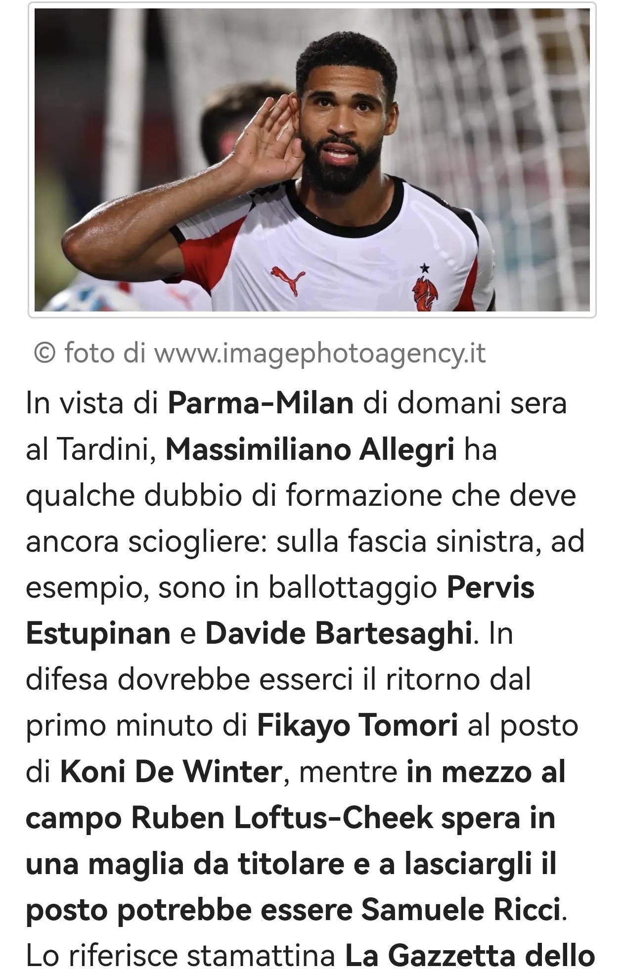 พรุ่งนี้เย็น มิลานจะเดินทางไปยังสนามสตาดิโอ ทาร์ดินี เพื่อพบกับปาร์มา โดยมัสซิมิเลียโน อัลเลกรียังคงเก็บความลับเกี่ยวกับผู้เล่นตัวจริงบางส่วนไว้ เช่น ในตำแหน่งริมเส้นฝั่งซ้าย เอสตูปีญานและบัลตาซาร์จะแข่งขันกันเพื่อแย่งตำแหน่งตัวจริง