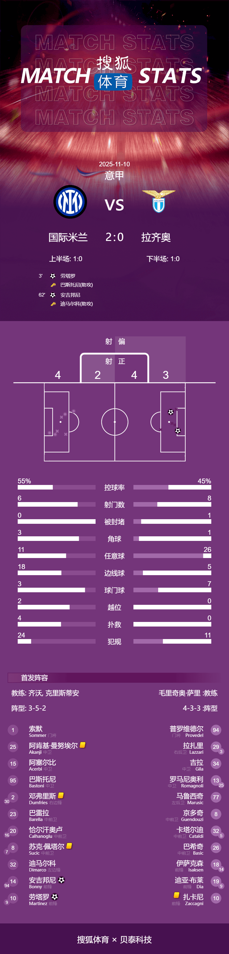 เวลา 03:45 น. ตามเวลาปักกิ่ง วันที่ 10 พฤศจิกายน การแข่งขันเซเรีย อา นัดที่ 11 ได้เริ่มขึ้นที่สนามซาน ซิโร โดยอินเตอร์ มิลาน เปิดบ้านรับการมาเยือนของลาซิโอ ในครึ่งแรก ลาอูตาโร่ ทำประตูแรกให้กับอินเตอร์ มิลานได้ไม่นานหลังจากเริ่มเกม ในครึ่งหลัง โบนี่ ทำประตูที่สองให้กับทีมเจ้าบ้านเพื่อรักษาชัยชนะไว้ได้ ในที่สุด อินเตอร์ มิลาน เอาชนะลาซิโอ 2-0 ขึ้นนำเป็นจ่าฝูงของตารางคะแนนเซเรีย อา