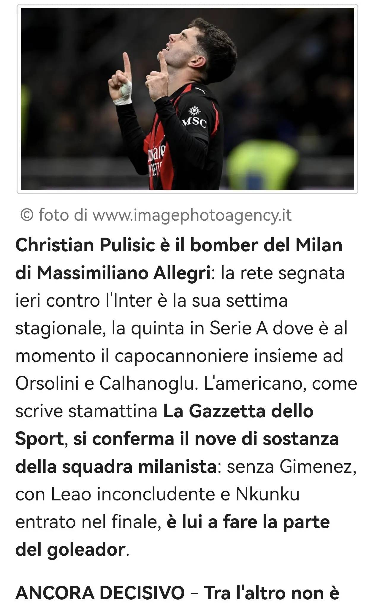 คริสเตียน พูลิซิช ได้สร้างตัวเองขึ้นมาเป็นกองหน้าคนสำคัญของอัลเลกรีที่มิลาน – ประตูเมื่อคืนที่ผ่านมากับอินเตอร์ทำให้เขายิงได้ทั้งหมดเจ็ดประตูในฤดูกาลนี้ รวมถึงห้าประตูในเซเรีย อา ซึ่งเขาอยู่ในตำแหน่งผู้ทำประตูสูงสุดของลีกร่วมกับออร์โซลินีและชัลฮาโนกลู