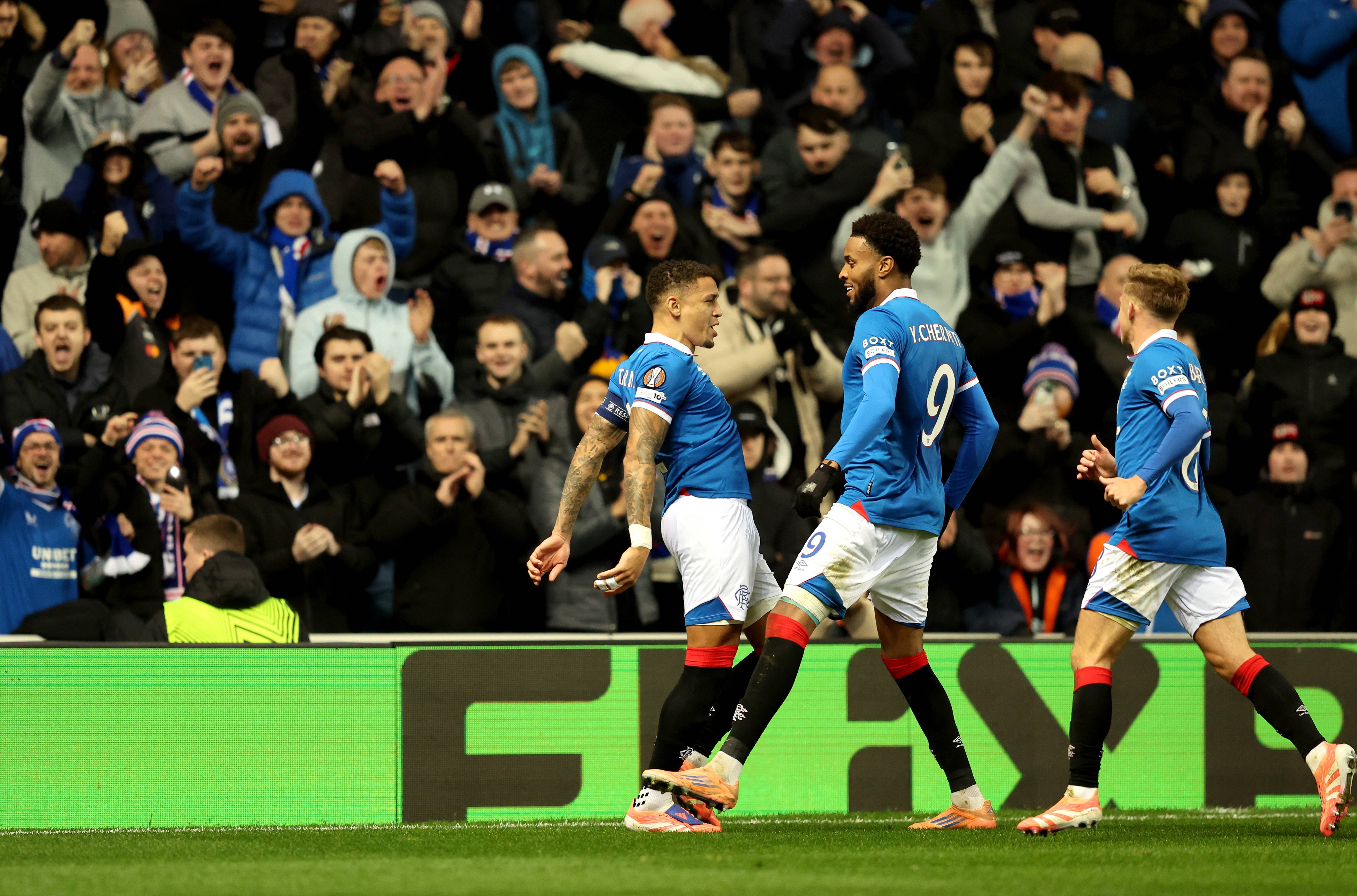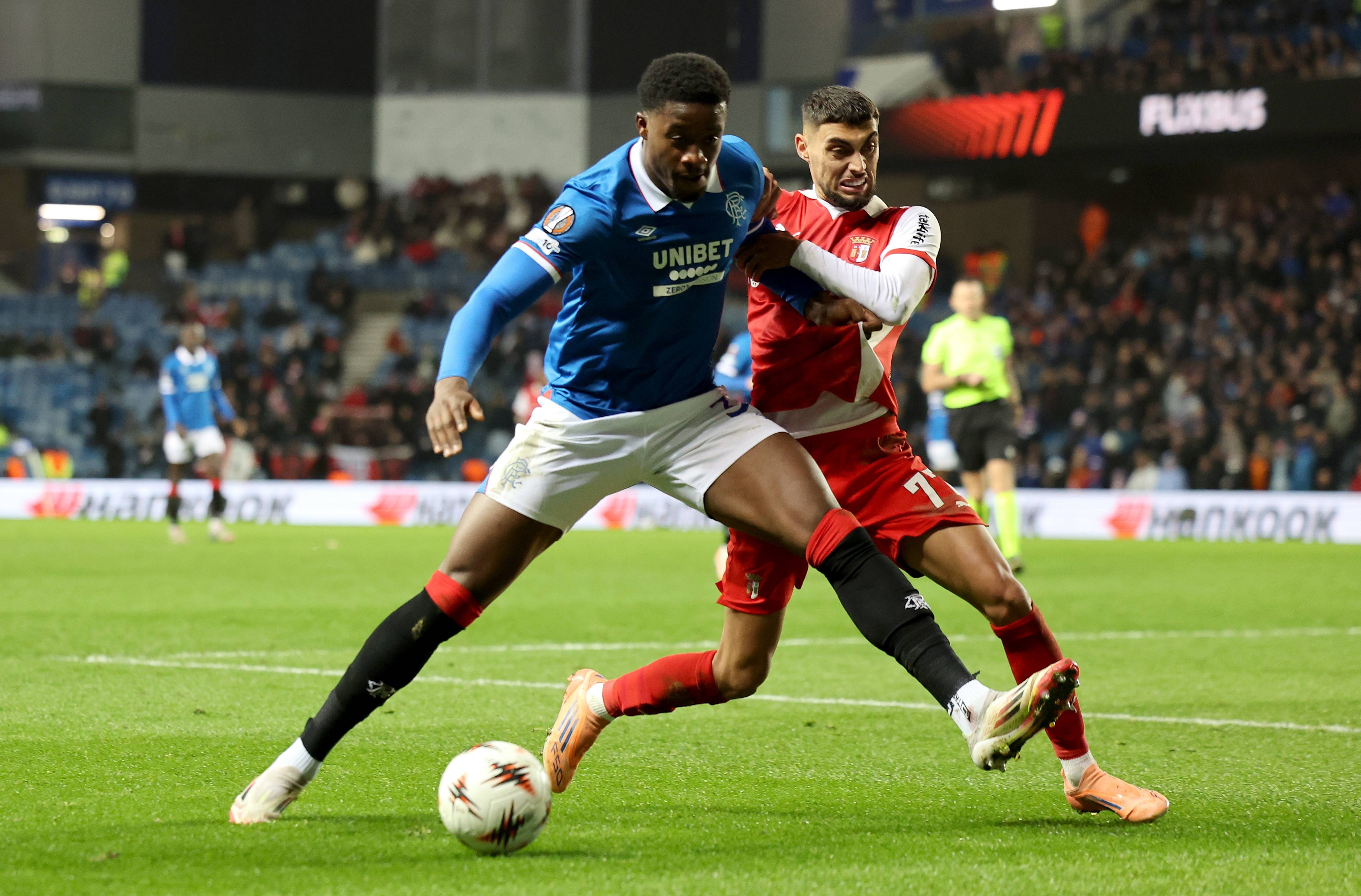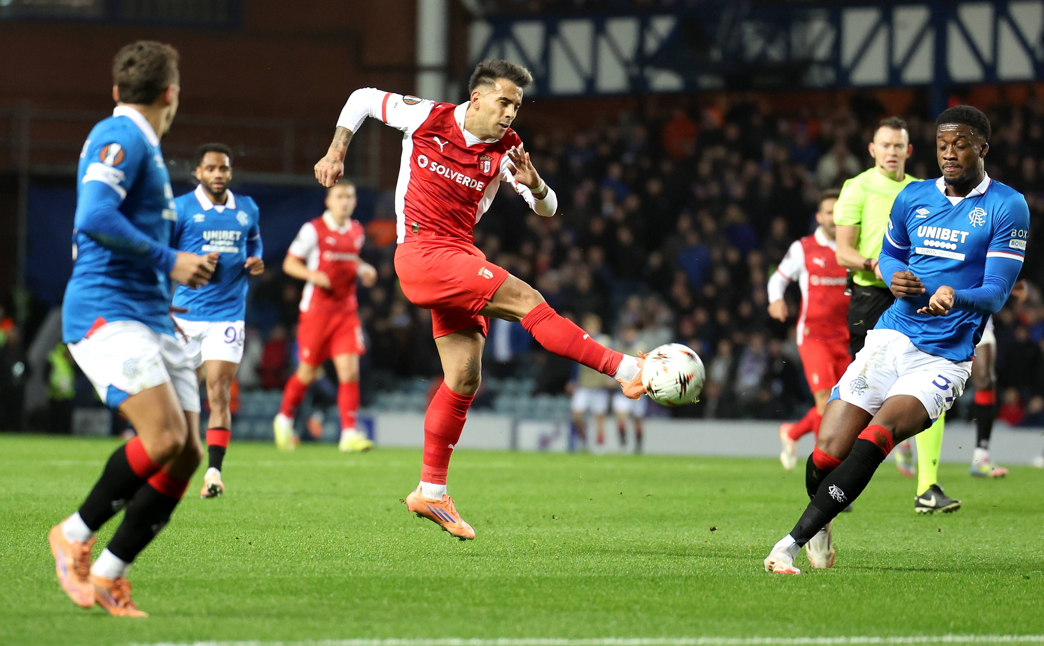 เมื่อวันที่ 27 พฤศจิกายน นักเตะของเรนเจอร์ส บาร์เรน (ขวา) เข้าแย่งบอลกับโกเมส นักเตะของบรากา ซีเอ็นเอ/อีพีเอ