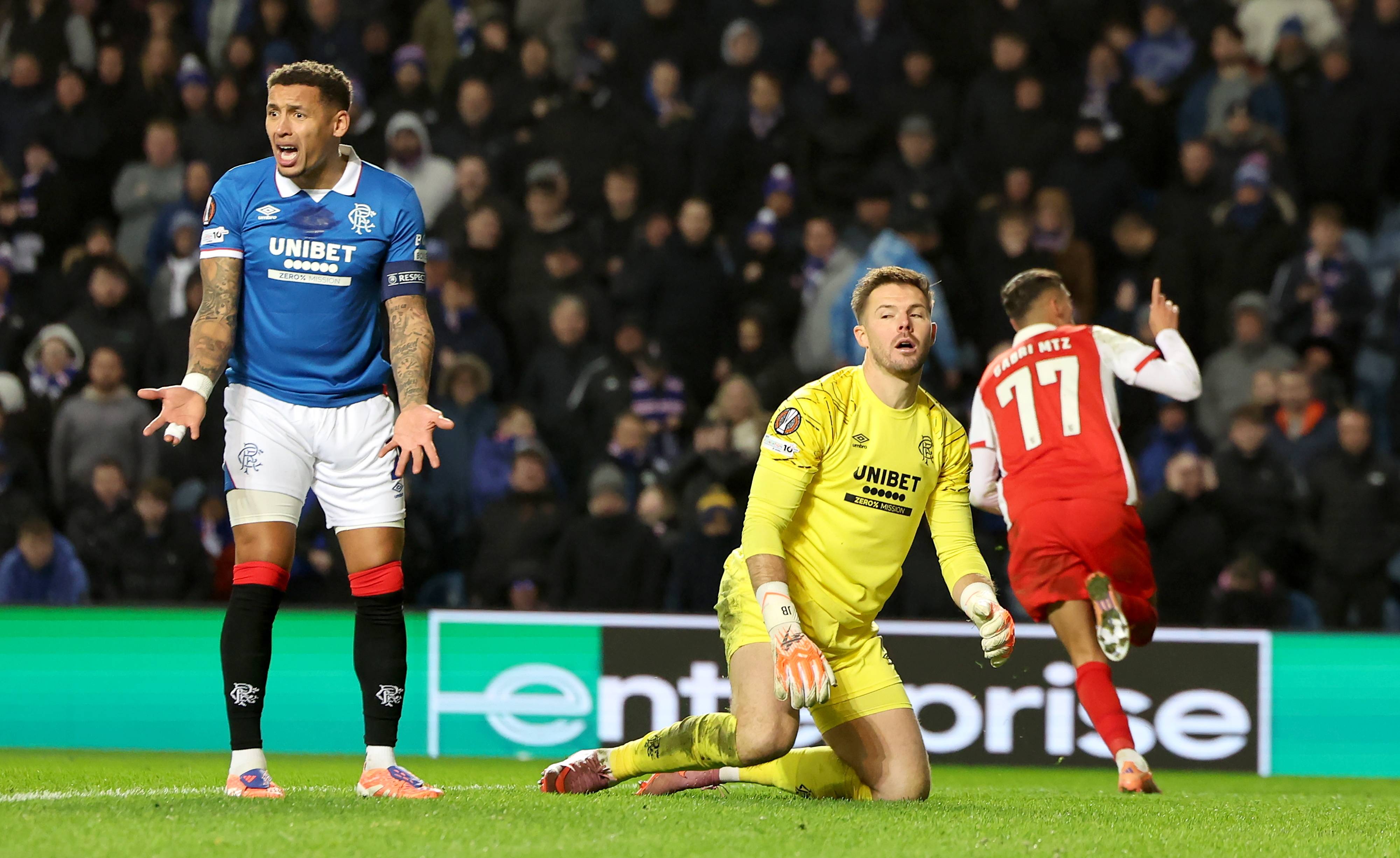 เมื่อวันที่ 27 พฤศจิกายน จอร์แดน เบตแลนด์ ผู้รักษาประตูของกลาสโกว์ เรนเจอร์ส (ขวา) เซฟลูกยิงจากเปโดร ฮอร์ตา ผู้เล่นของบรากา สำนักข่าวซินหัว/EPA
