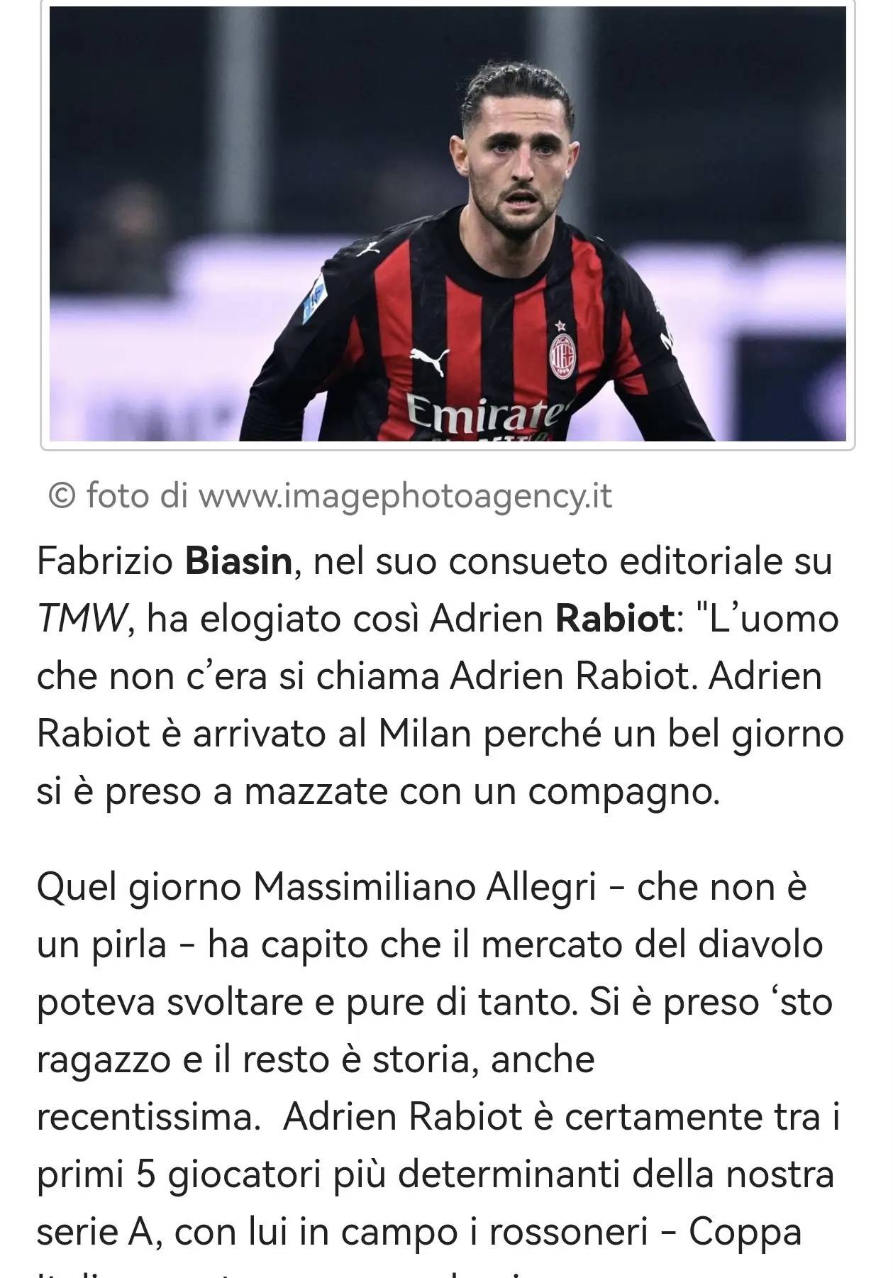 ฟาบริซิโอ บิอานคินี ได้ยกย่อง อาเดรียน ราบิโอต์ ในคอลัมน์ประจำของเขาสำหรับ TMW: "ชิ้นส่วนสำคัญของปริศนานี้มีชื่อว่า อาเดรียน ราบิโอต์ การย้ายทีมของราบิโอต์ไปยังมิลานเกิดขึ้นจากการทะเลาะกันอย่างรุนแรงกับเพื่อนร่วมทีมในวันหนึ่งที่มาร์กเซย"