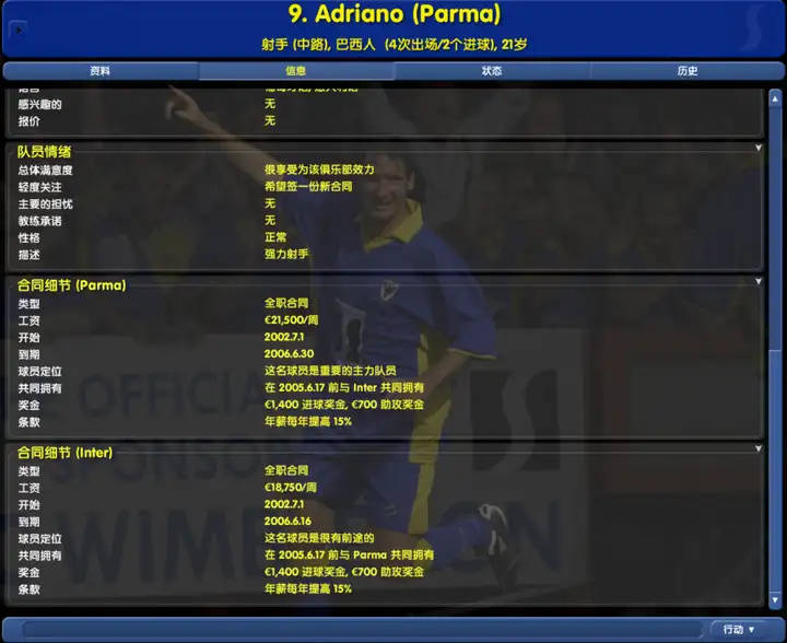 ค่าจ้างของอาเดรียโน่ที่ปาร์ม่าอยู่ที่ 21,500 ยูโรต่อสัปดาห์ ขณะที่ที่อินเตอร์ มิลาน อยู่ที่ 18,750 ยูโรต่อสัปดาห์ โดยมีข้อกำหนดเพิ่มเติมสำหรับโบนัสและเงื่อนไขเงินเดือนประจำปี