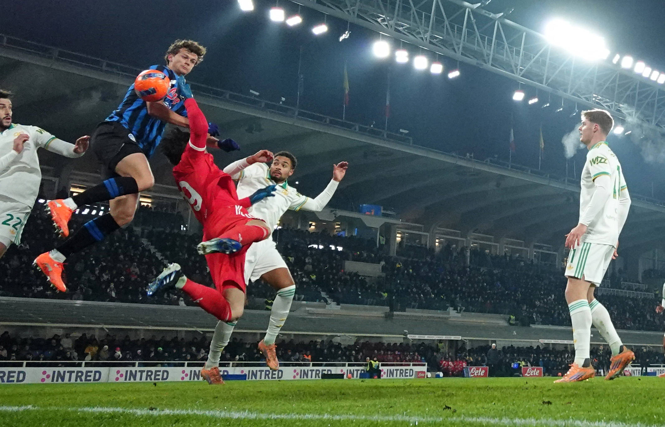 เมื่อวันที่ 3 มกราคม นักเตะอตาลันต้า สกาลวินี (คนที่สองจากซ้าย) ทำประตูระหว่างการแข่งขัน สำนักข่าวซินหัว (ภาพโดย อัลแบร์โต ลิงเรีย)