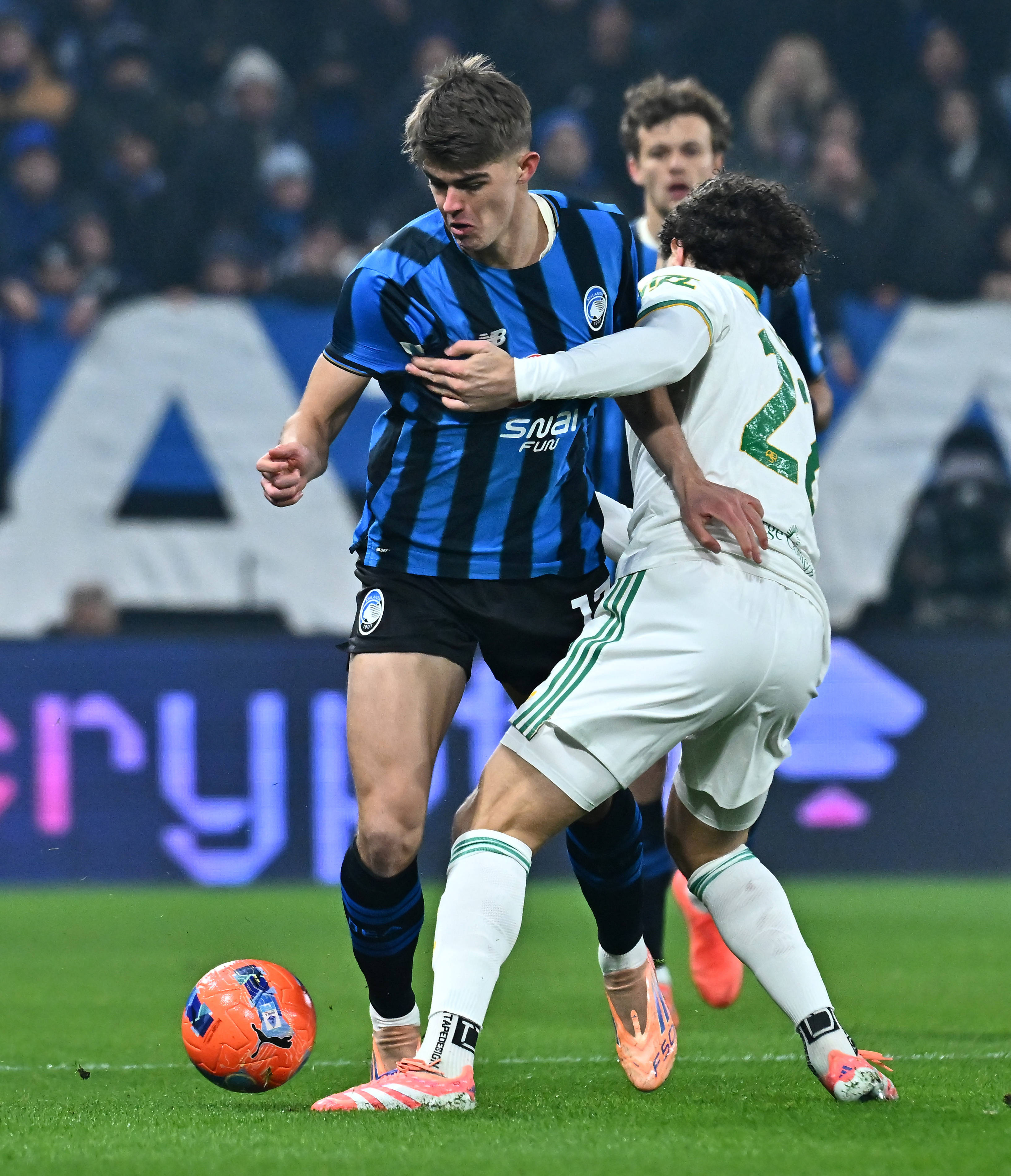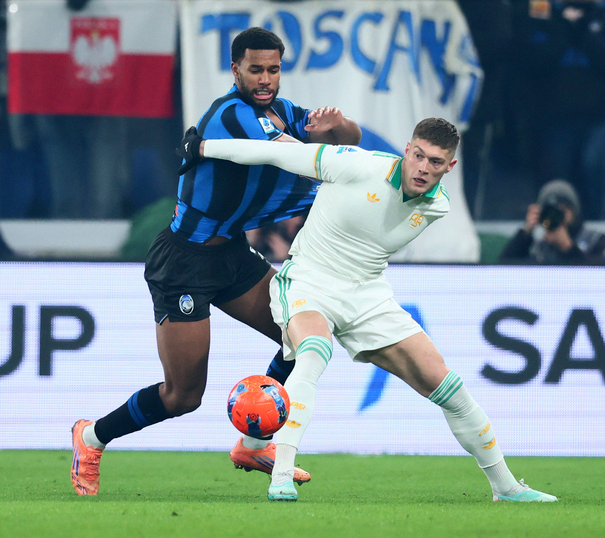 เมื่อวันที่ 3 มกราคม, นักเตะของอตาลันต้า ฌอน (ซ้าย) ท้าทายนักเตะของโรมา โดฟบิก ระหว่างการแข่งขัน. สำนักข่าวซินหัว (ภาพโดย อัลแบร์โต ลิงเลีย)