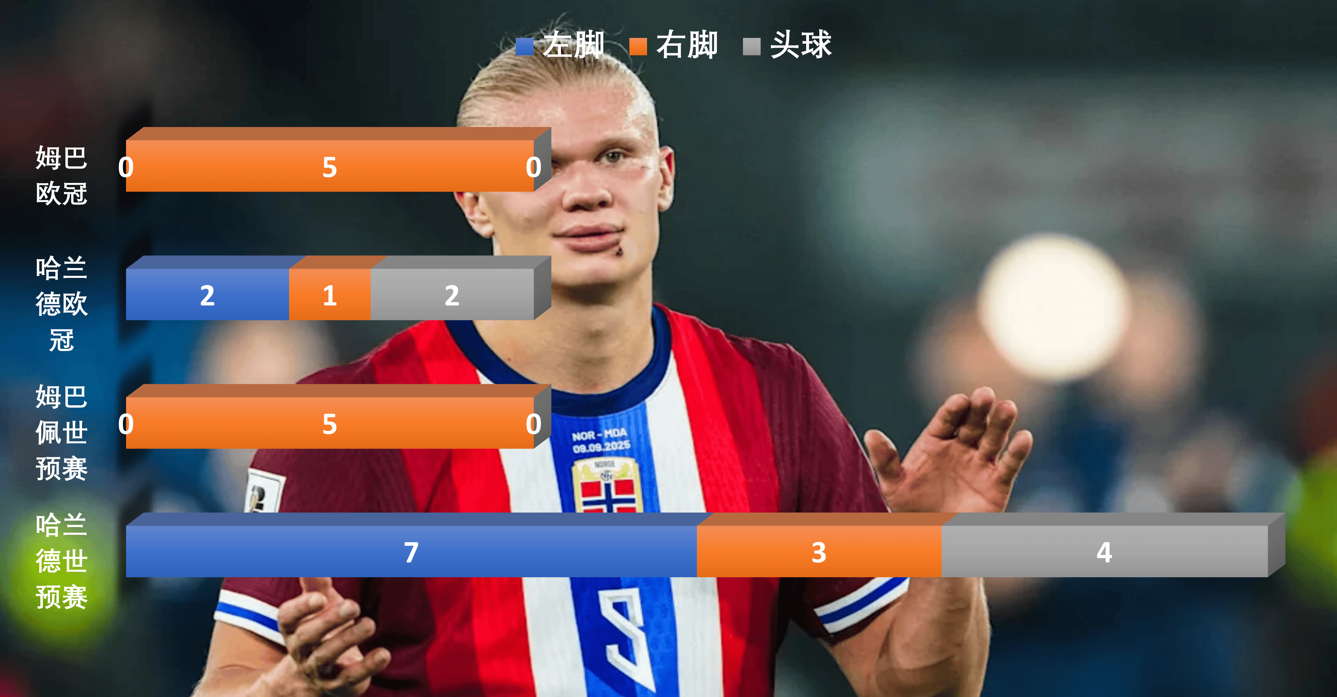 ในทางตรงกันข้าม ในขณะที่เก้าจาก 19 ประตูของฮาแลนด์มาจากเท้าซ้ายอันทรงพลังของเขา เขายังทำประตูได้อีกสี่ครั้งด้วยเท้าขวาที่อ่อนกว่า และทำประตูได้หกครั้งด้วยศีรษะของเขา