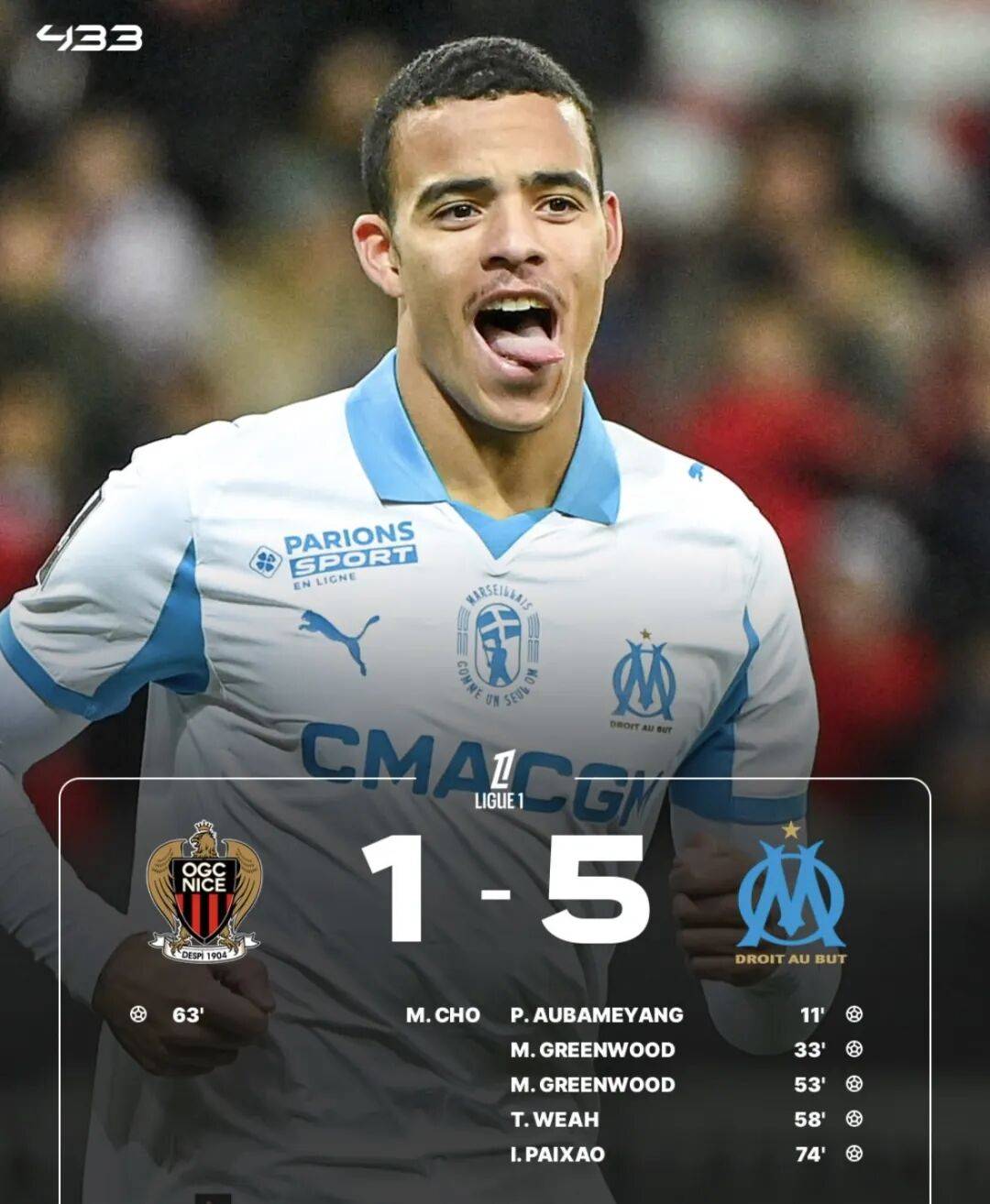 ในรอบที่ 13 ของลีกเอิง กรีนวูดทำประตูสองครั้งช่วยให้มาร์กเซยเอาชนะนีซ 5-1 ในเกมเยือน