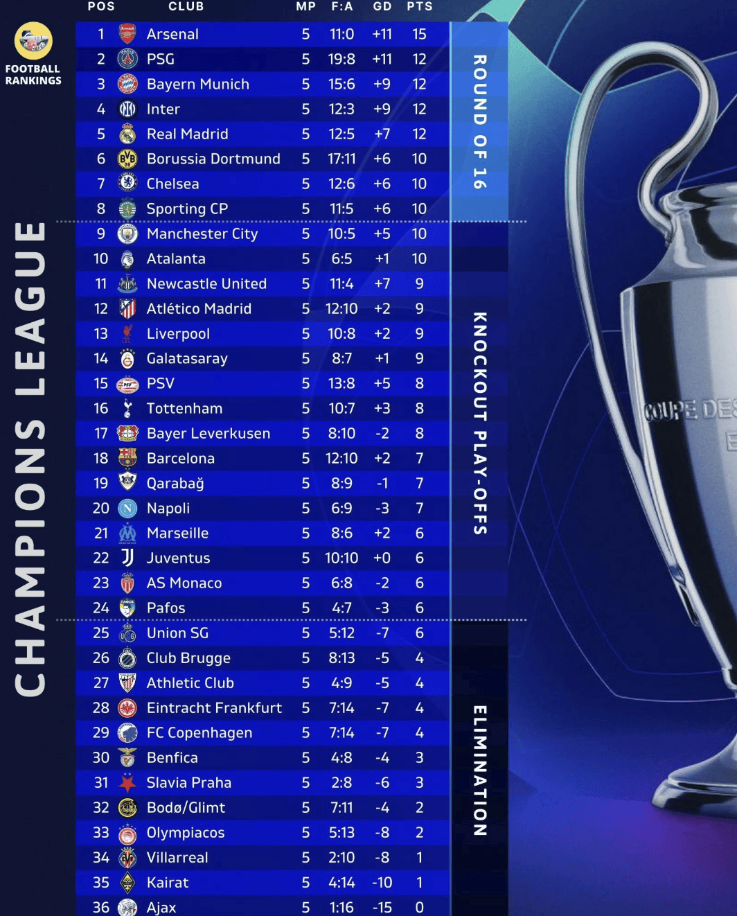 3-1! ผู้นำแชมเปียนส์ลีกเปลี่ยน: บาเยิร์นหล่นไปอยู่อันดับสาม! อดีตนักเตะ PSG ยิง 9 ประตูใน 5 นัด ขึ้นนำตารางดาวซัลโว_อาร์เซนอล_เอ็มบัปเป้_แอสซิสต์