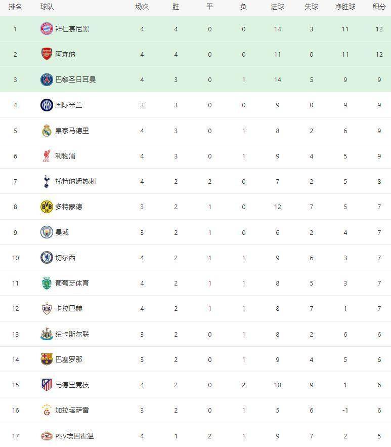 ตารางคะแนนแชมเปียนส์ลีกอยู่ในความวุ่นวายอย่างสิ้นเชิง บาเยิร์น มิวนิก และ อาร์เซนอล นำเป็นจ่าฝูงด้วยสถิติไร้พ่าย เตรียมเผชิญหน้ากันโดยตรงในรอบต่อไป ปารีส แซงต์-แชร์กแมง, อินเตอร์ มิลาน, เรอัล มาดริด และ ลิเวอร์พูล ต่างมี 9 คะแนนจาก 3 ชนะ 1 แพ้ ทีมจากอิตาลีทำผลงานได้แย่ที่สุด: นาโปลีเก็บได้เพียง 4 คะแนนจาก 4 นัด ขณะที่ ยูเวนตุส ยังไม่ชนะใครเลย มีเพียงผลเสมอเท่านั้น