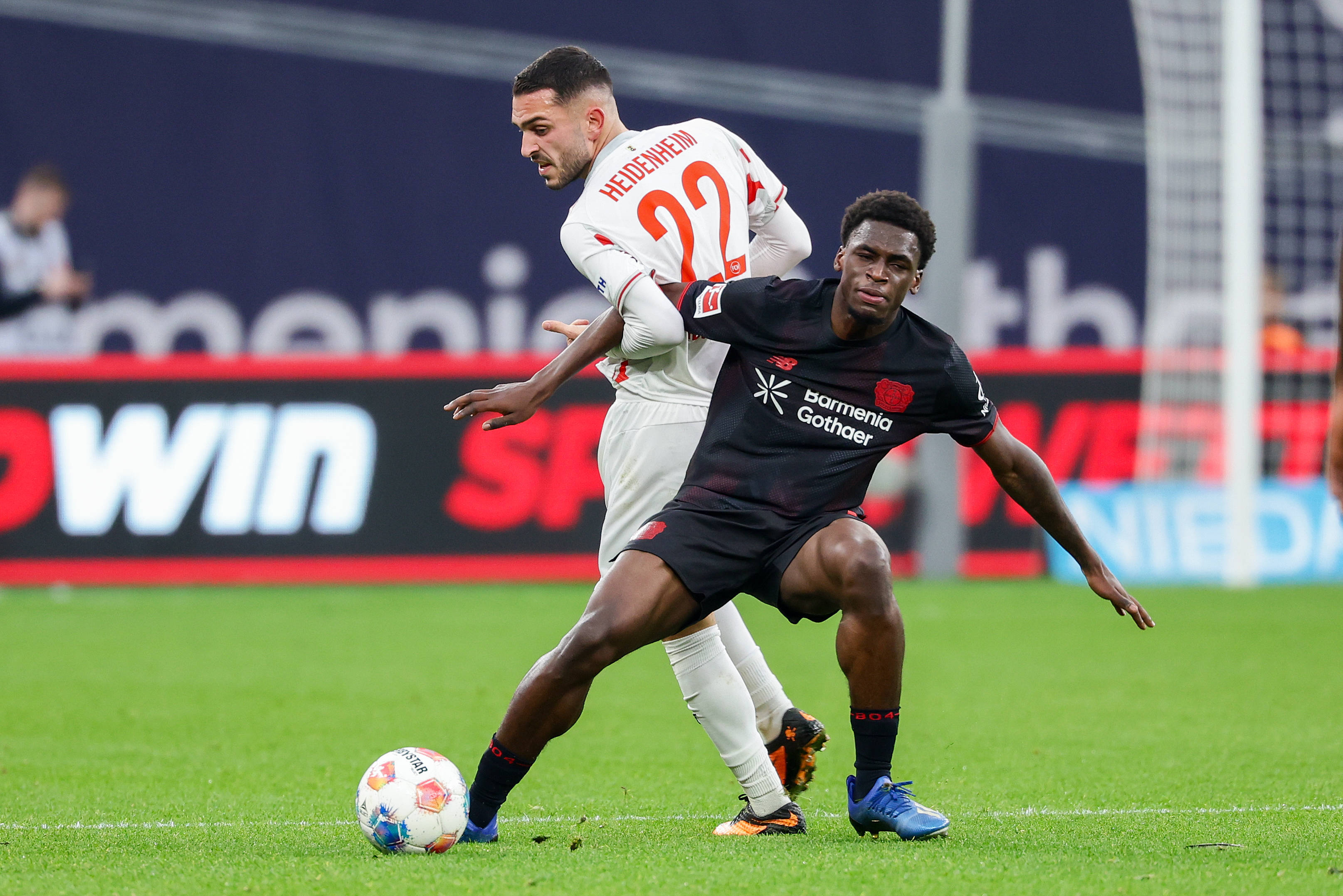 เมื่อวันที่ 8 พฤศจิกายน มาทซ์ (ขวา) ของไบเออร์ เลเวอร์คูเซ่น และตราโอเร่ ของไฮเดนไฮม์ แย่งชิงบอลระหว่างการแข่งขัน สำนักข่าวซินหัว (ภาพโดย Joachim Bivalliez)